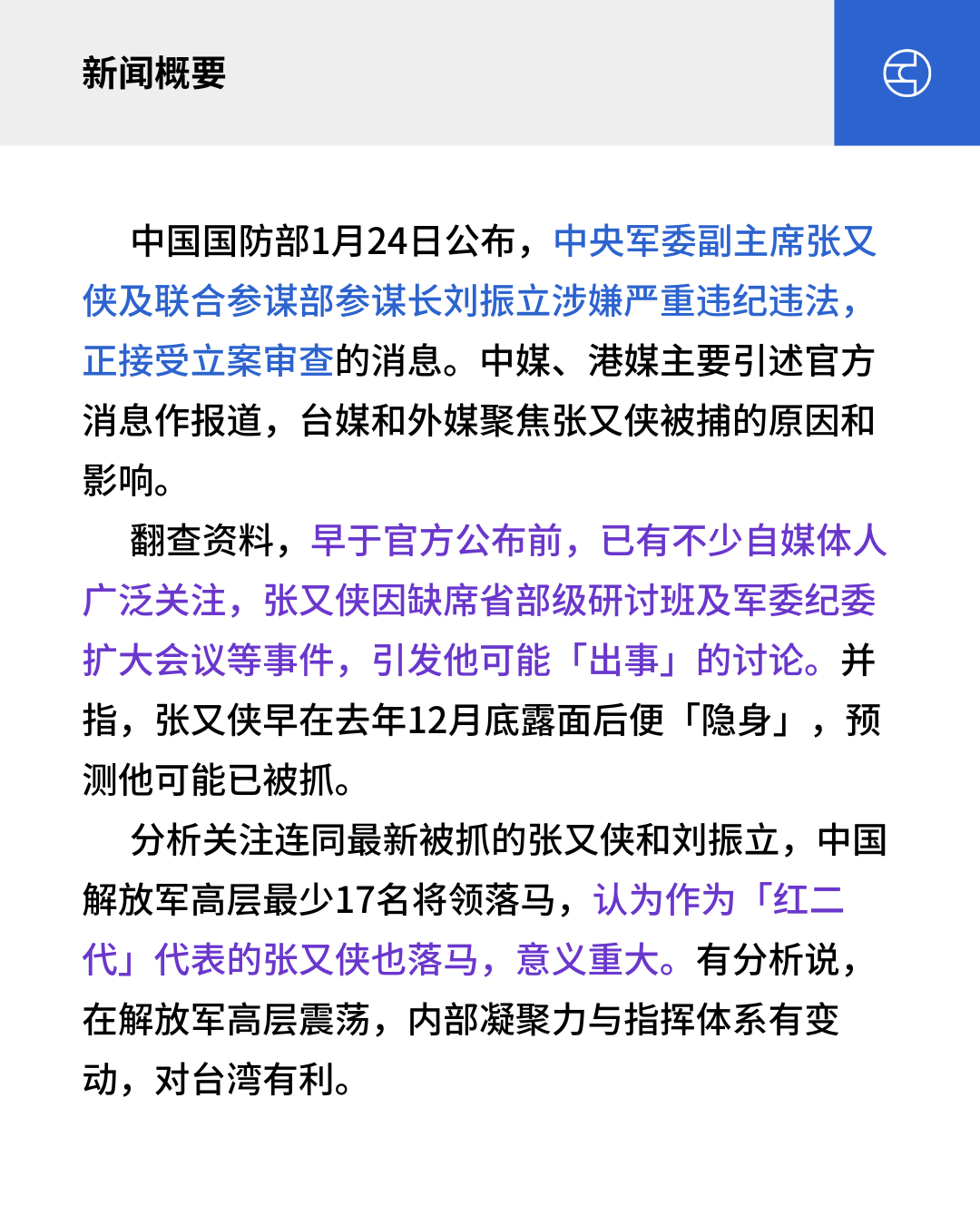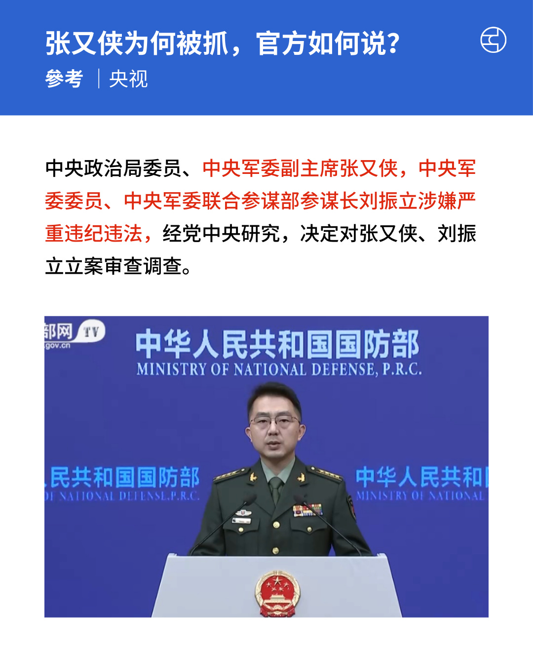 中国国防部1月24日公布,中央军委副主席张又侠及联合参谋部参谋长刘振立涉嫌严重违纪违法,正接受立案审查的消息。中媒、港媒主要引述官方消息作报道,台媒和外媒聚焦张又侠被捕的原因和影响。