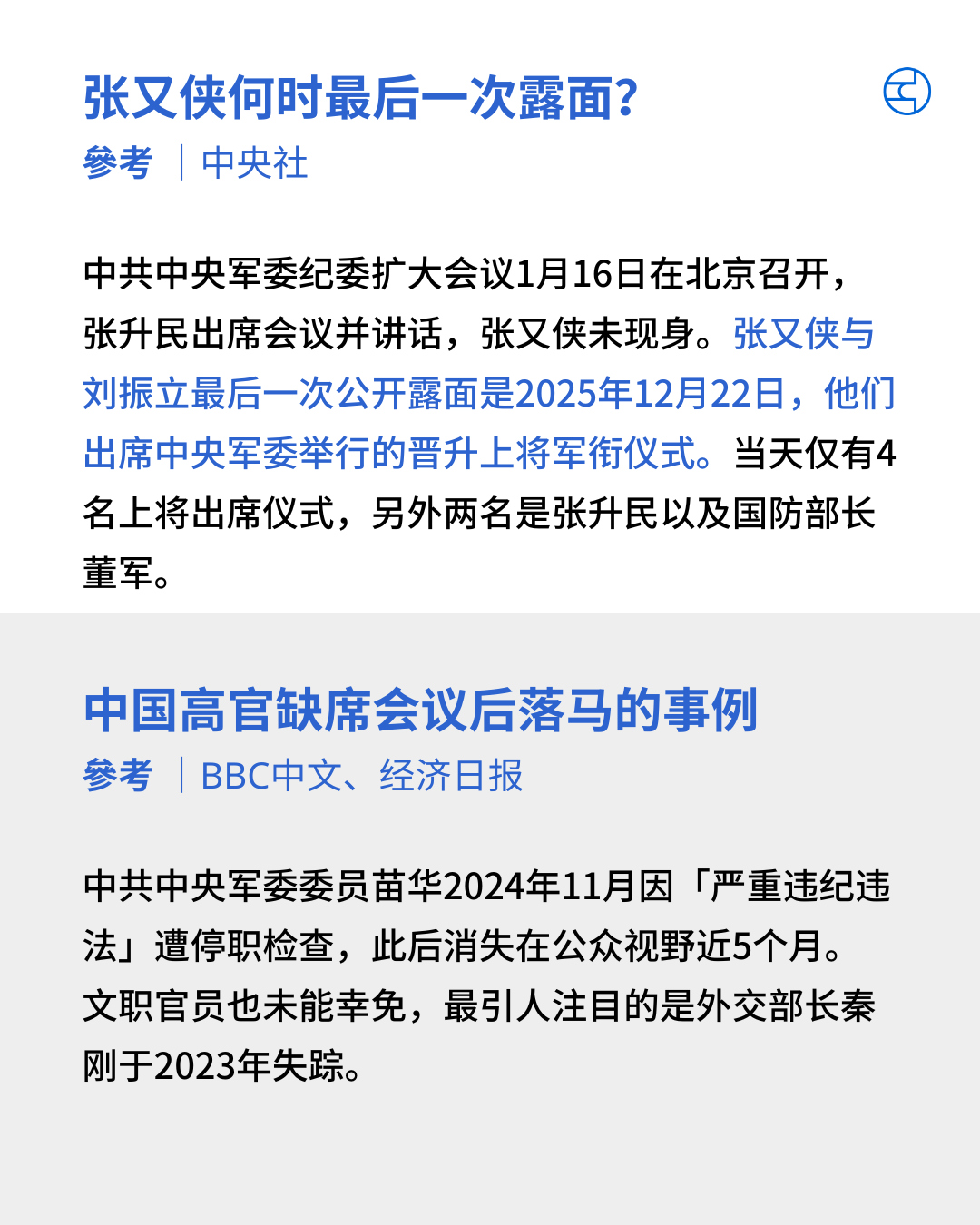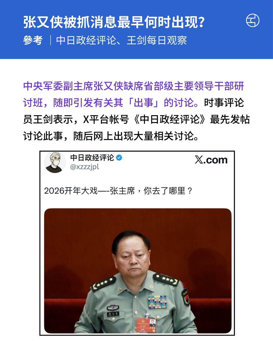 翻查资料,早于官方公布前,已有不少自媒体人广泛关注,张又侠因缺席省部级研讨班及军委纪委扩大会议等事件,引发可能「出事」的讨论。并指,张又侠早在去年12月底露面后便「隐身」,预测他可能已被抓。