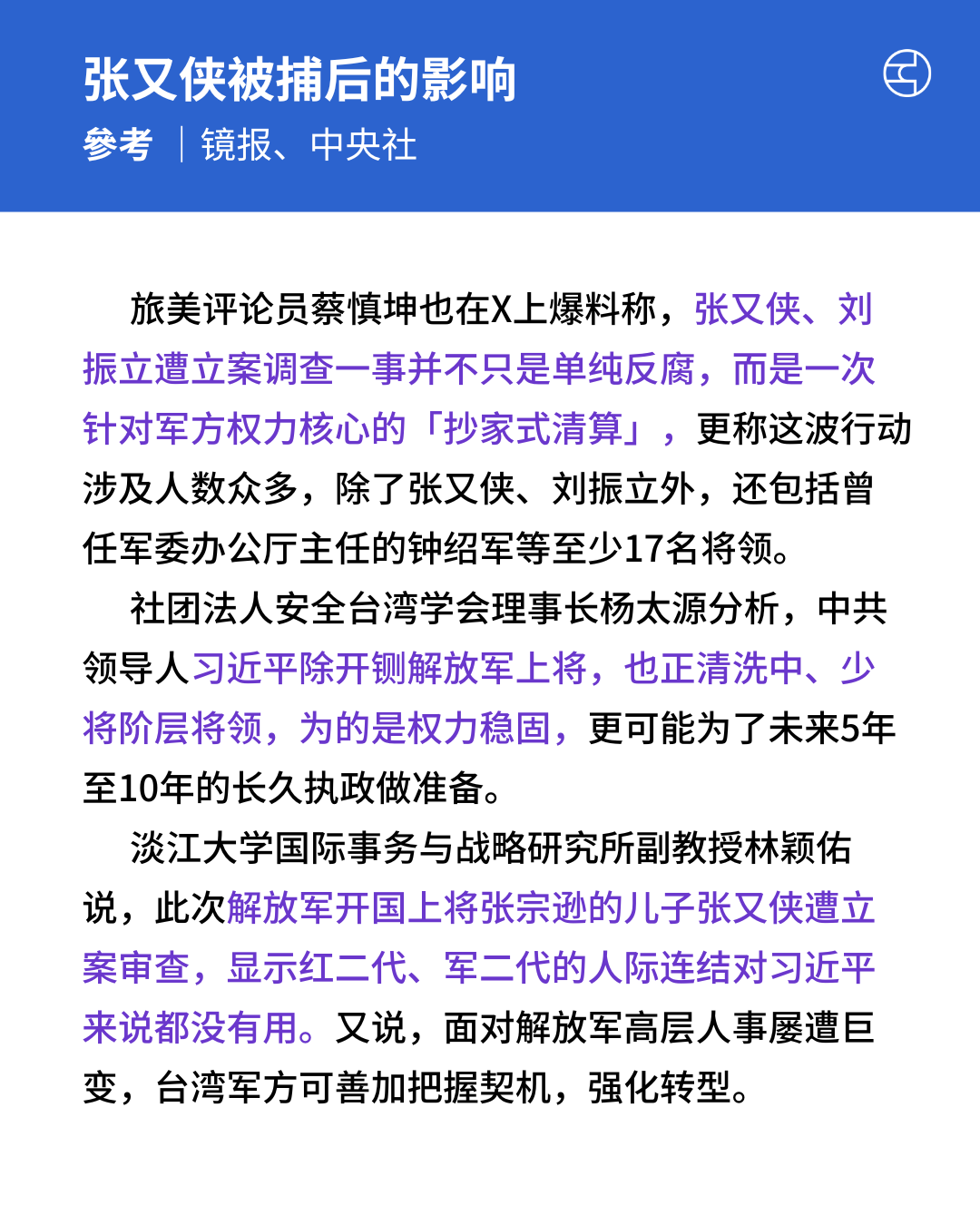 分析关注连同最新被抓的张又侠和刘振立,中国解放军高层最少17名将领落马,认为作为「红二代」代表的张又侠也落马,意义重大。有分析说,在解放军高层震荡,内部凝聚力与指挥体系有变动,对台湾有利。