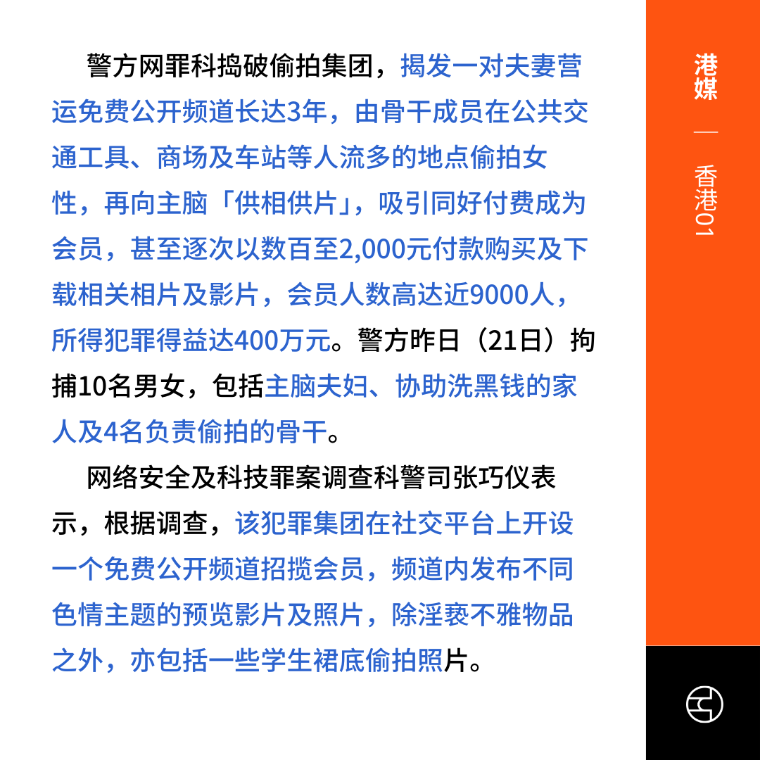 《香港01》警搗偷拍集團拘10人 揭夫婦開頻道3年吸9000會員 骨幹供相供片