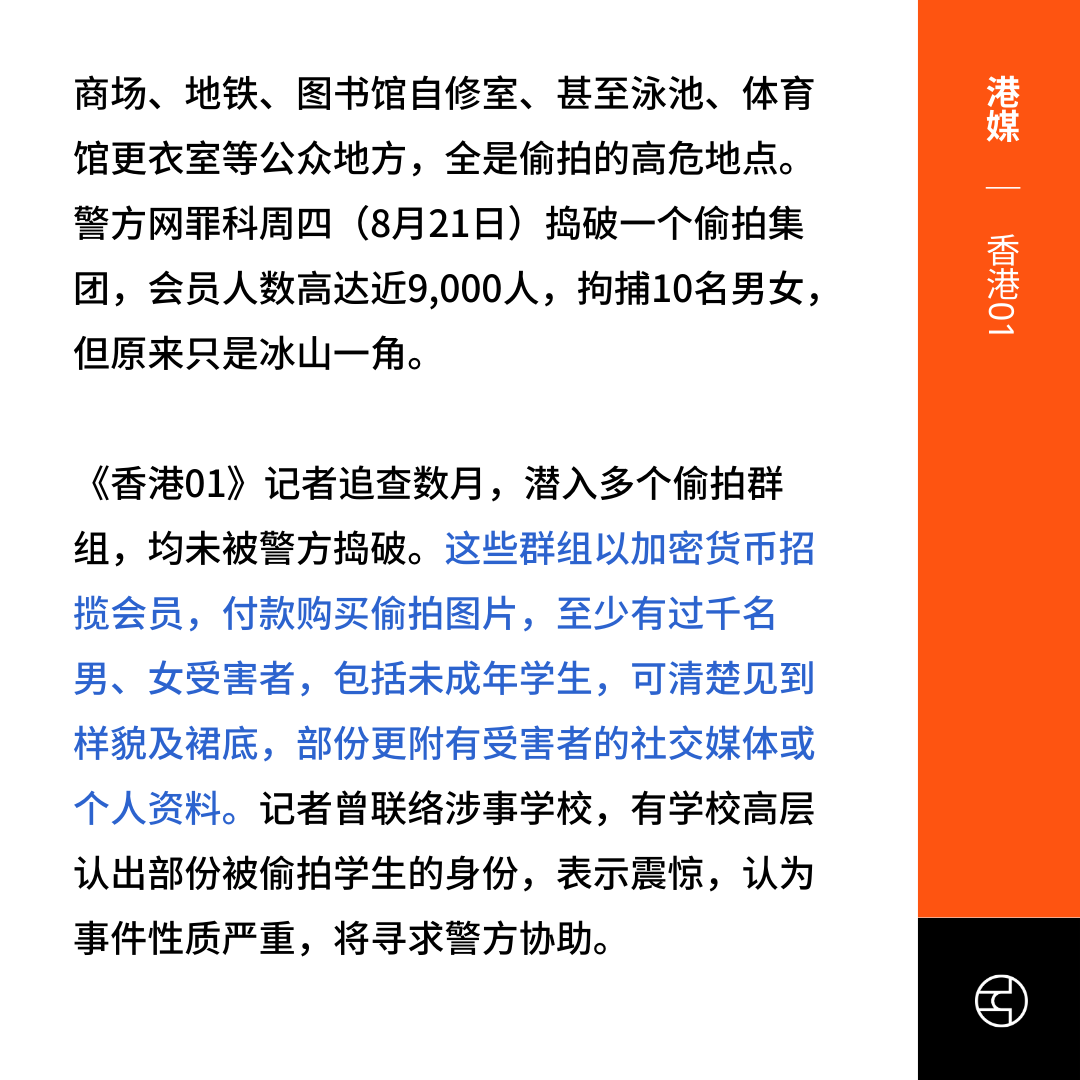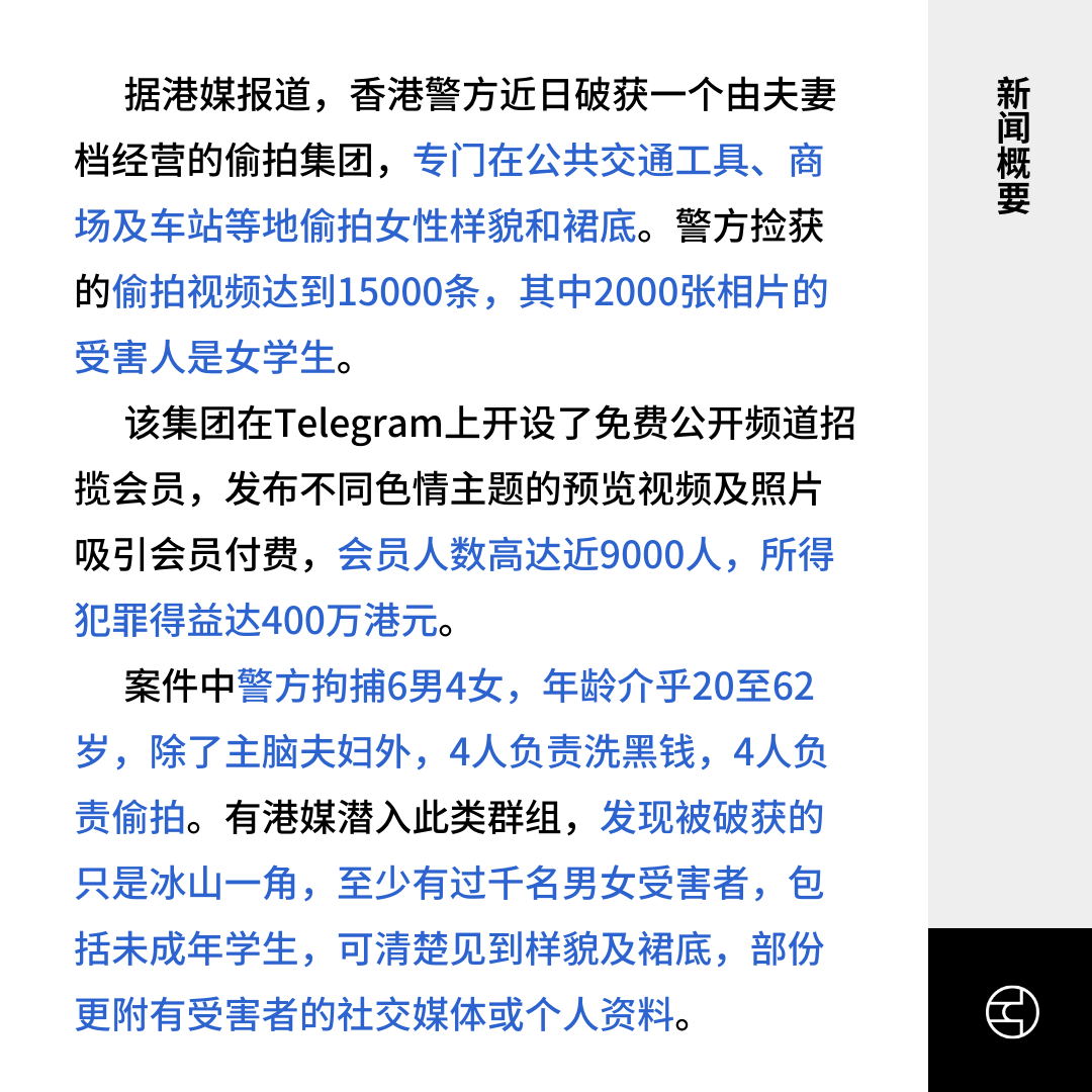 据港媒报道,香港警方近日破获一个由夫妻档经营的偷拍集团,专门在公共交通工具、商场及车站等地偷拍女性样貌和裙底。警方捡获的偷拍视频达到15000条,其中2000张相片的受害人是女学生。