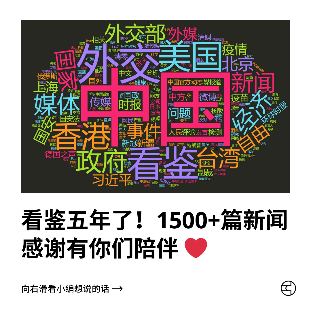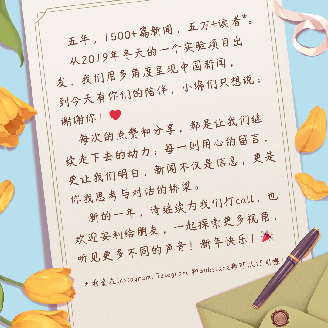 看鉴五年了!1500+篇新闻,感谢有你们陪伴 ❤️看鉴中国 Outsight ChinaJan 01, 2025Share五年,1500+篇新闻,五万+读者*。从2019年冬天的一个实验项目出发,我们用多角度呈现中国新闻,到今天有你们的陪伴,小编们只想说:谢谢你!❤️每次的点赞和分享,都是让我们继续走下去的动力;每一则用心的留言,更让我们明白,新闻不仅是信息,更是你我思考与对话的桥梁。新的一年,请继续为我们打call,也欢迎安利给朋友,一起探索更多视角,听见更多不同的声音!2025 新年快乐!🎉*看鉴在Instagram, Telegram 和Substack都可以订阅喔!立刻分享给朋友!SharePreviousNext