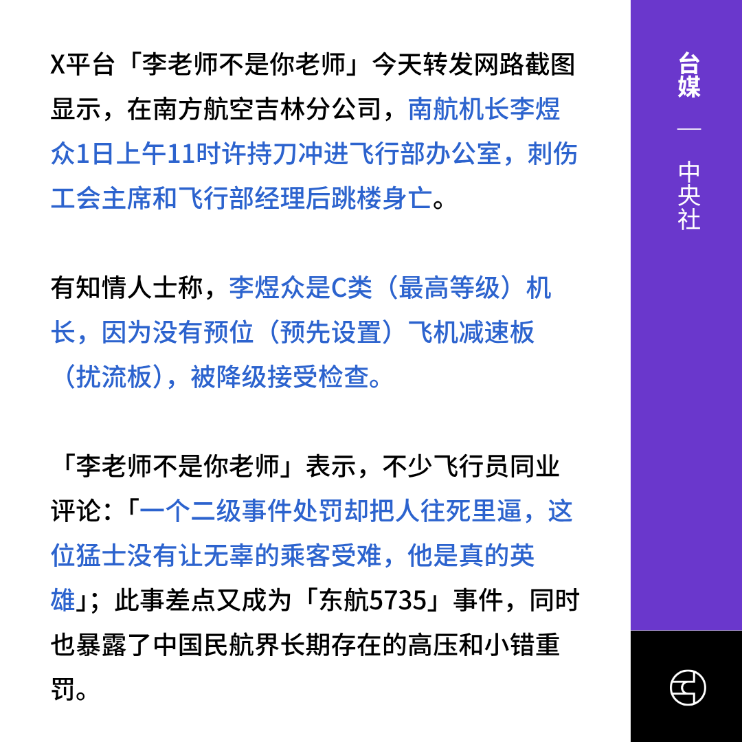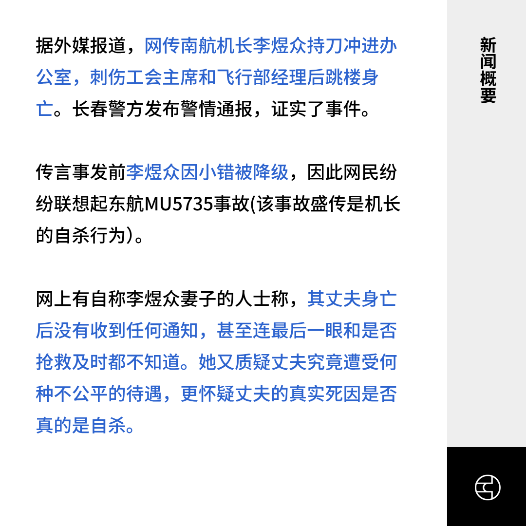 据外媒报道,网传南航机长李煜众持刀冲进办公室,刺伤工会主席和飞行部经理后跳楼身亡。长春警方发布警情通报,证实了事件。