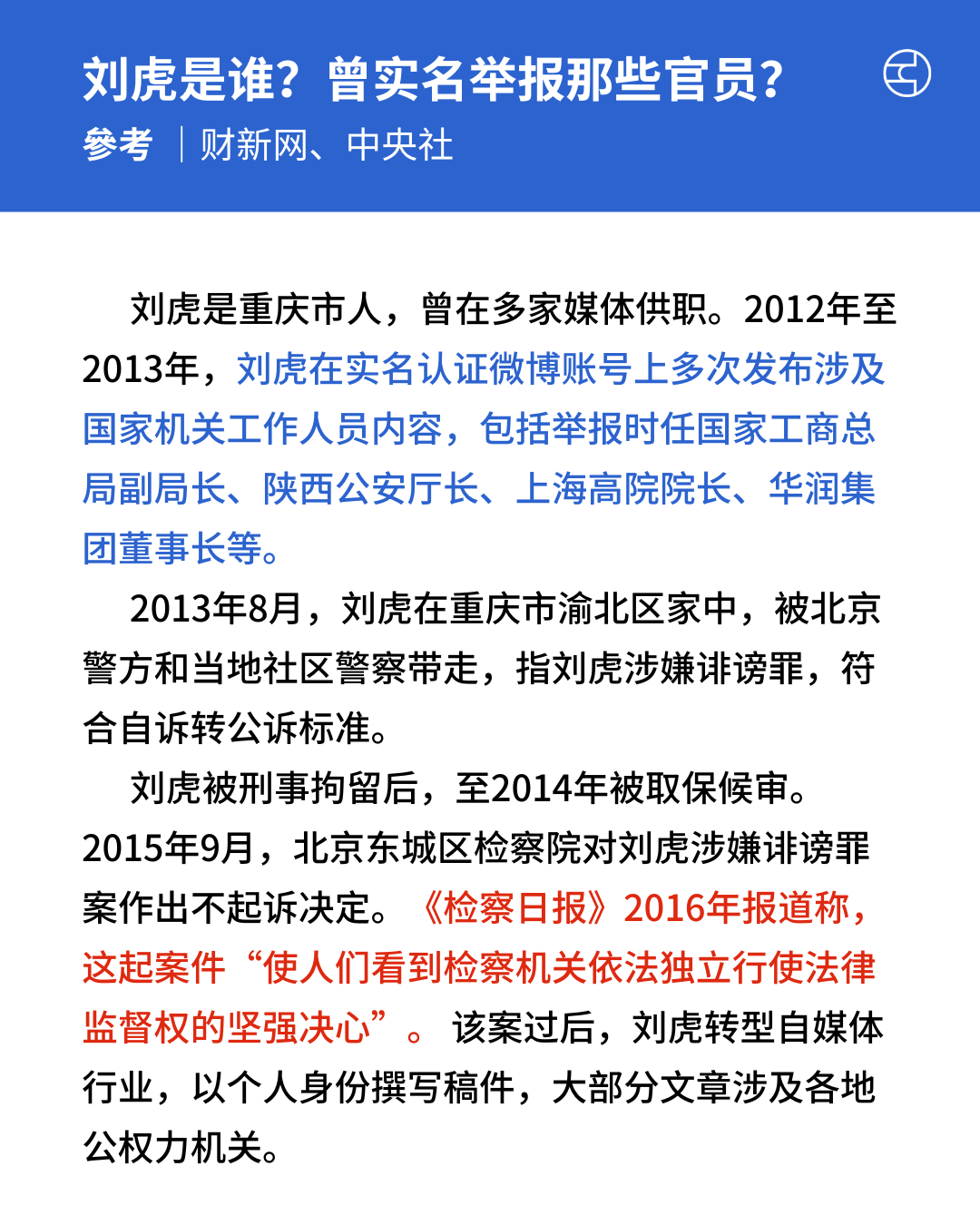刘虎因多次实名举报官员贪腐而知名。他在2013年,因实名举报国家工商总局局长马正其等,被北京警方以「寻衅滋事罪」拘捕,羁押一年后获准取保候审。检方以「事实不清、证据不足」不予起诉,此案更入选2015年中国十大传媒法治案例。