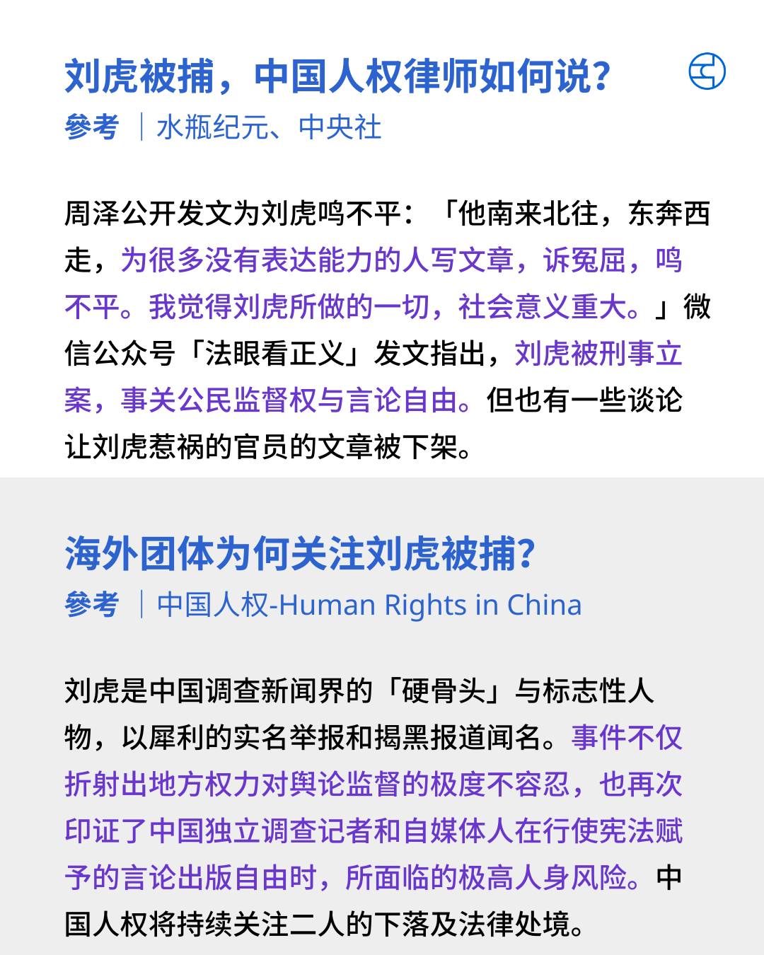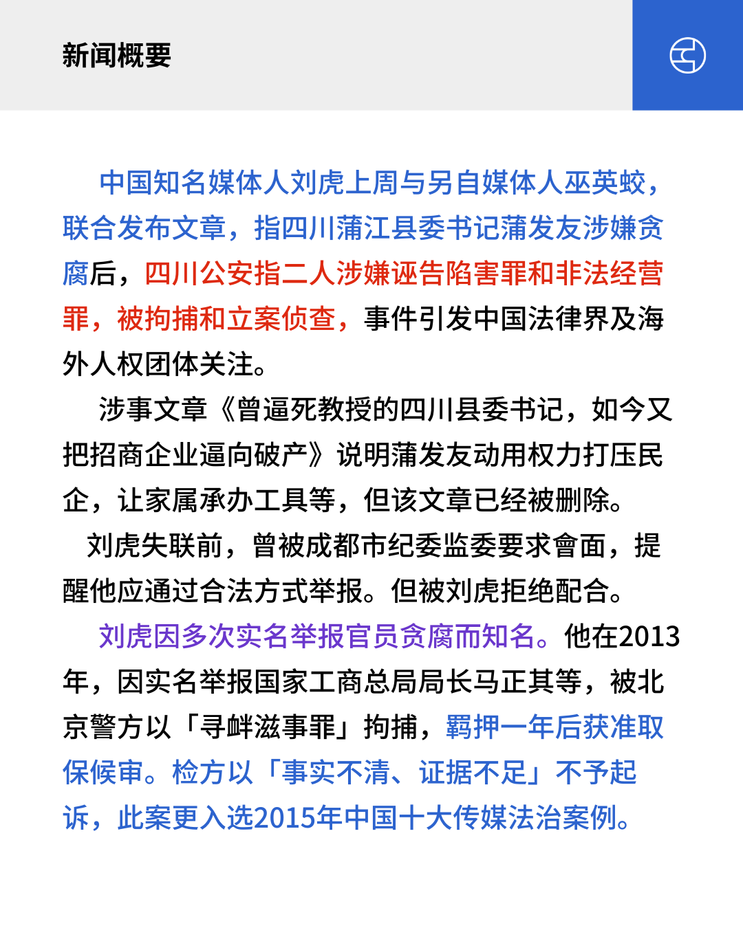 中国知名媒體人刘虎上周与另自媒体人巫英蛟,联合发布文章,指四川蒲江县委书记蒲发友涉嫌贪腐后,四川公安指二人涉嫌诬告陷害罪和非法经营罪,被拘捕和立案侦查,事件引发法律界及海外人权团体关注。