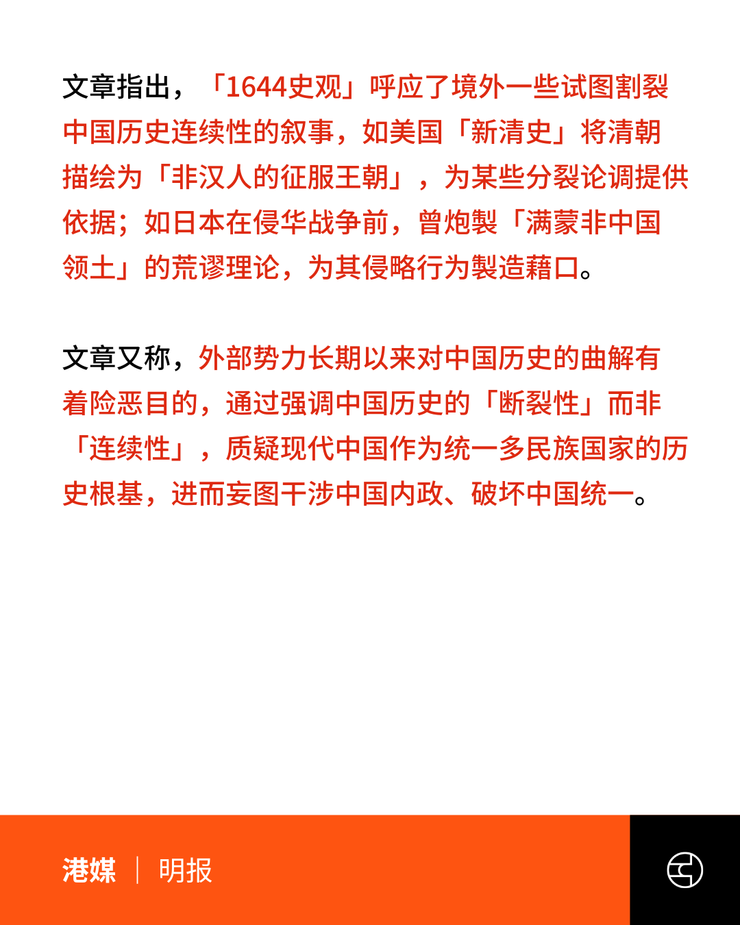 官方文章指出,该史观将清朝定性为“外来殖民政权”及“华夏文明中断”,实质是呼应境外“新清史”与日本旧有的“满蒙非中国论”。官方认为,这种强调历史“断裂性”的叙事旨在解构中国历史连续性,质疑现代统一多民族国家的根基,具有破坏国家统一的政治险恶目的。