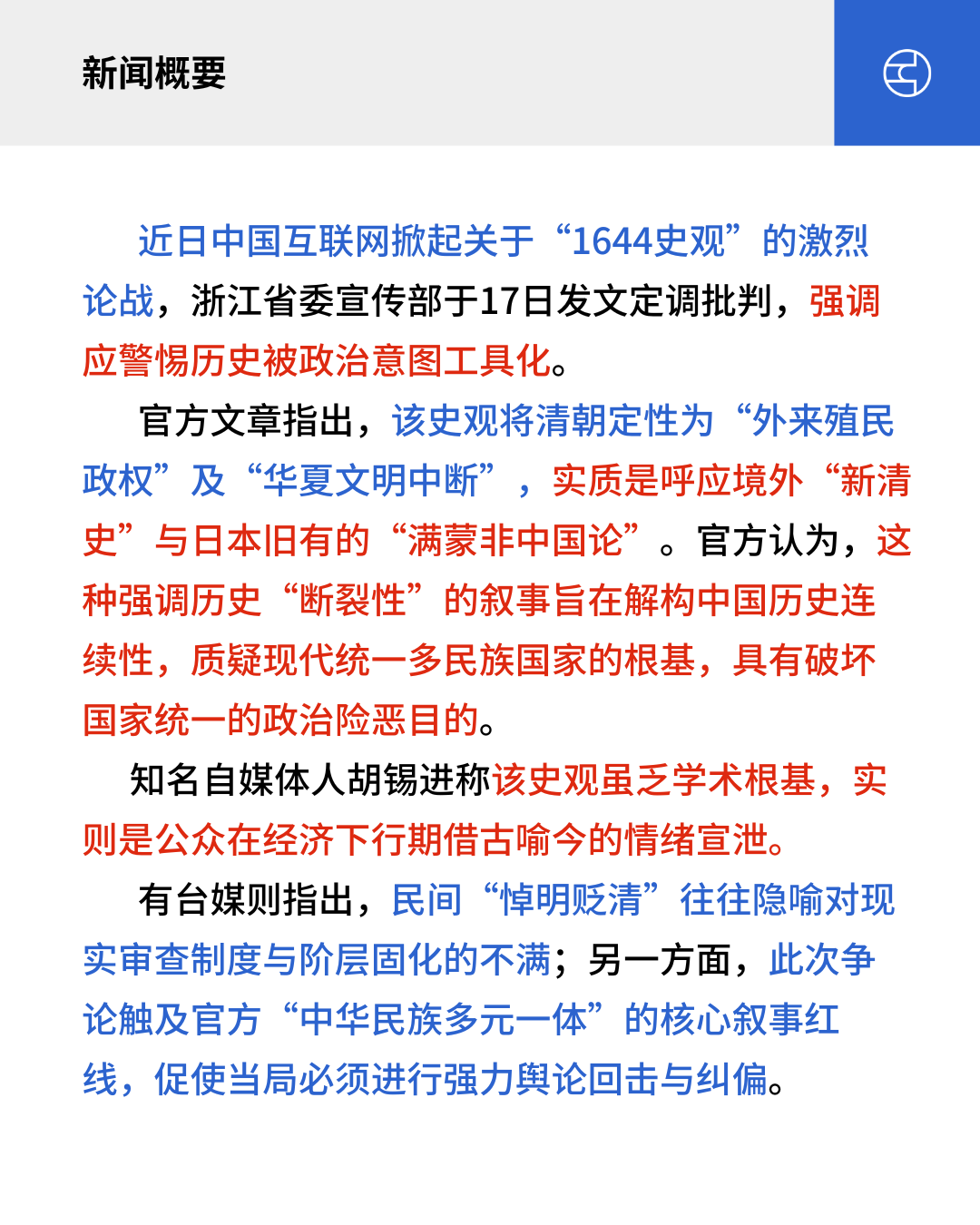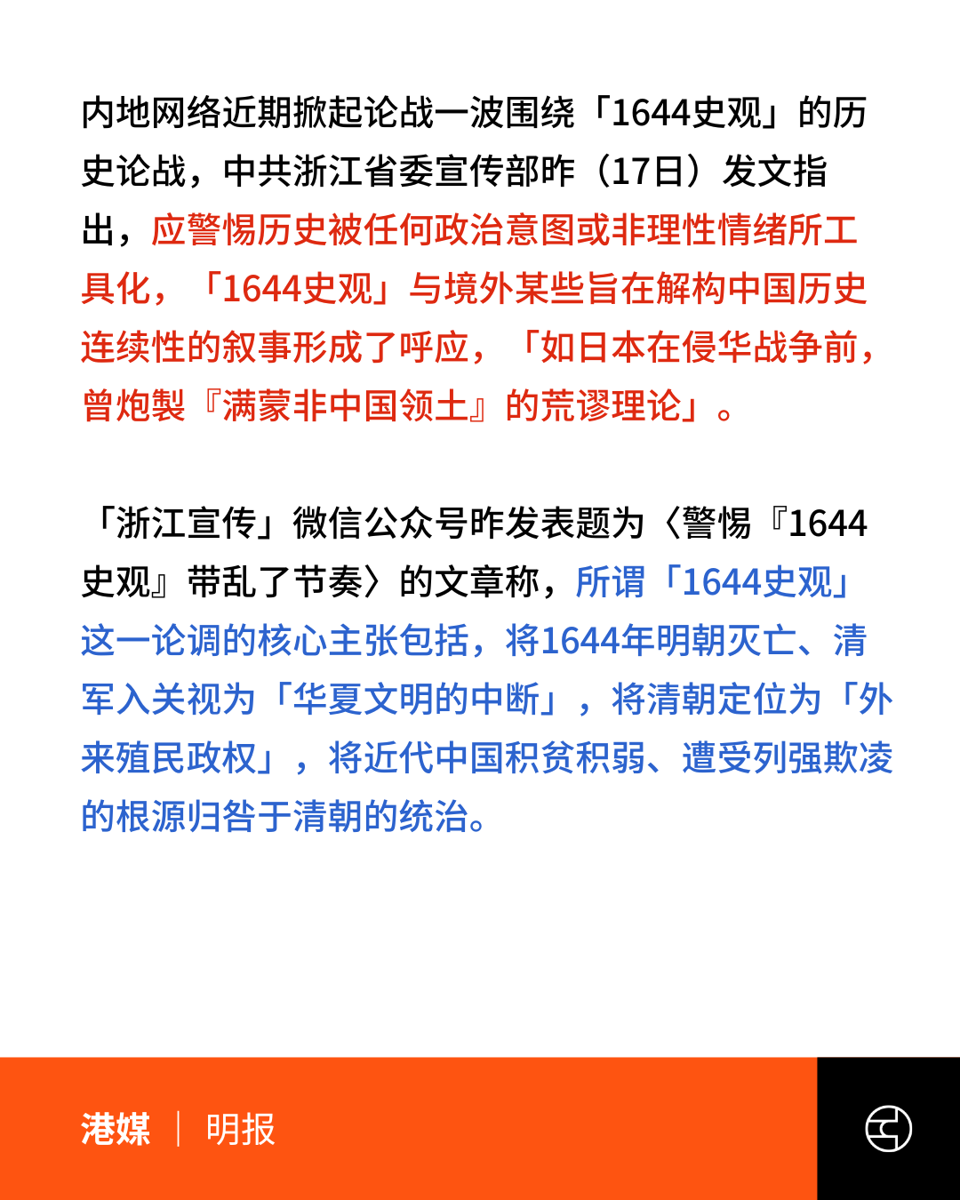 近日中国互联网掀起关于“1644史观”的激烈论战,浙江省委宣传部于17日发文定调批判,强调应警惕历史被政治意图工具化。