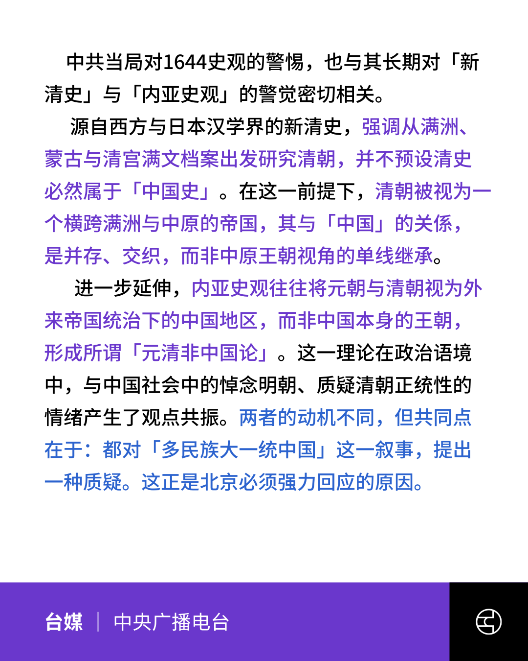 《中央廣播電台》捍衛大一統國家敘事!北京高調批評「1644史觀」