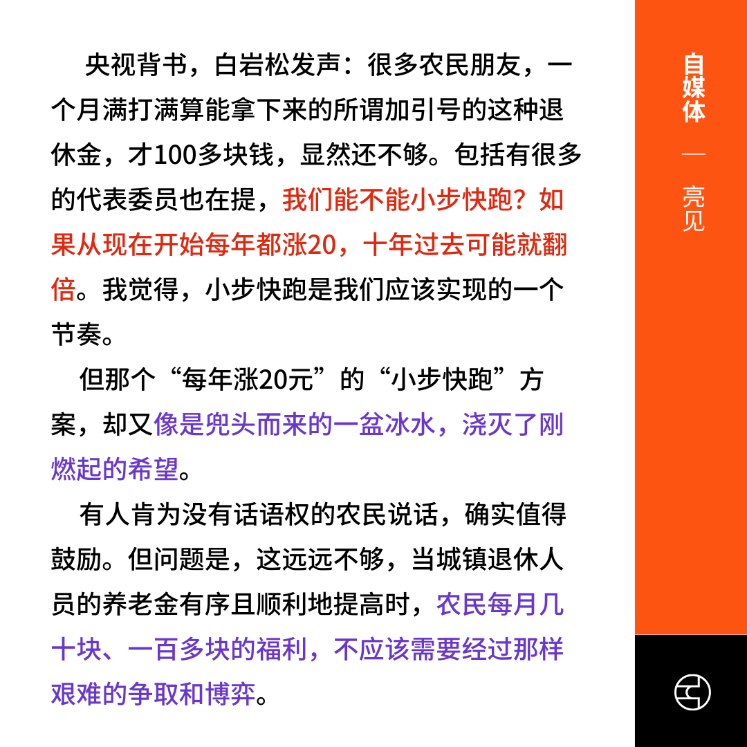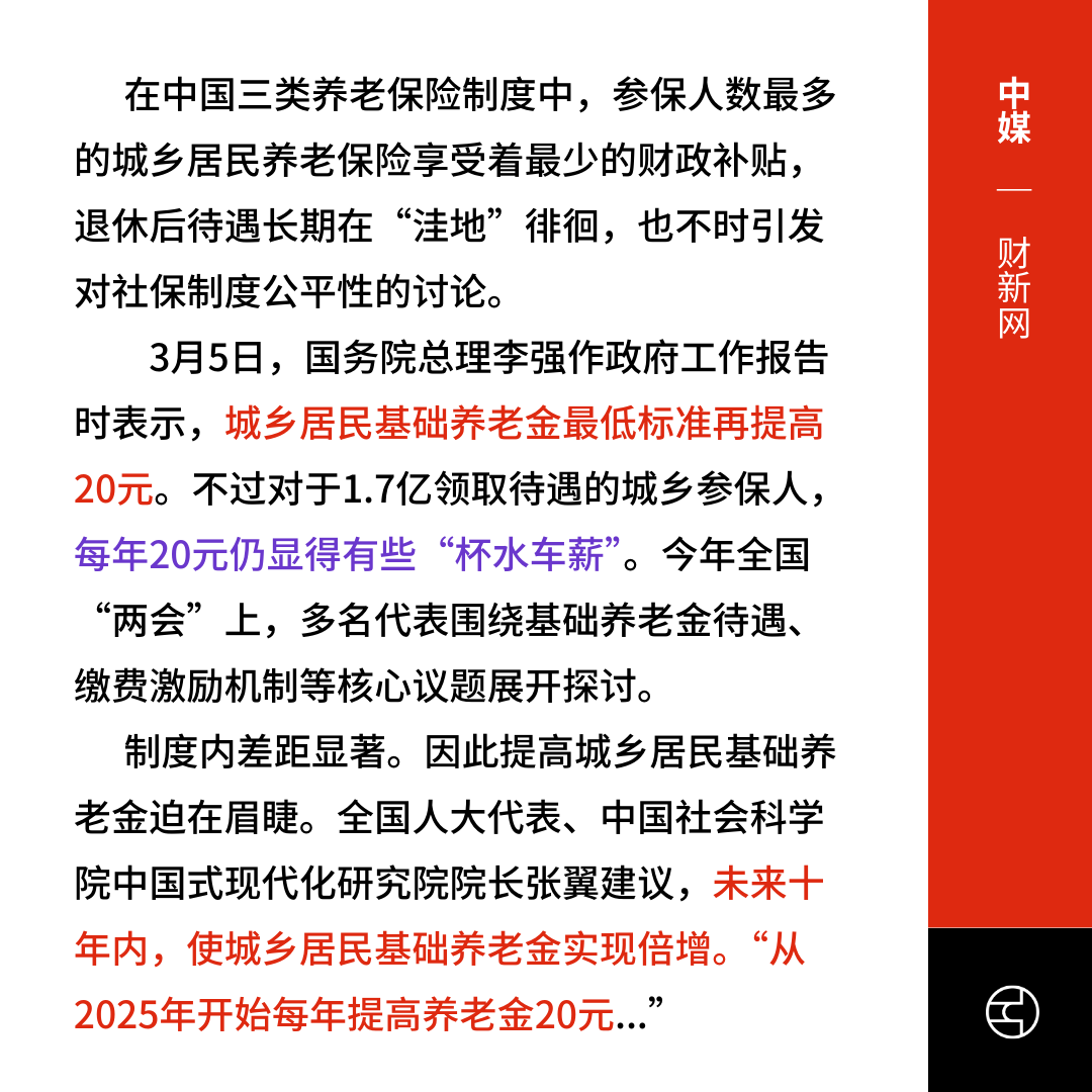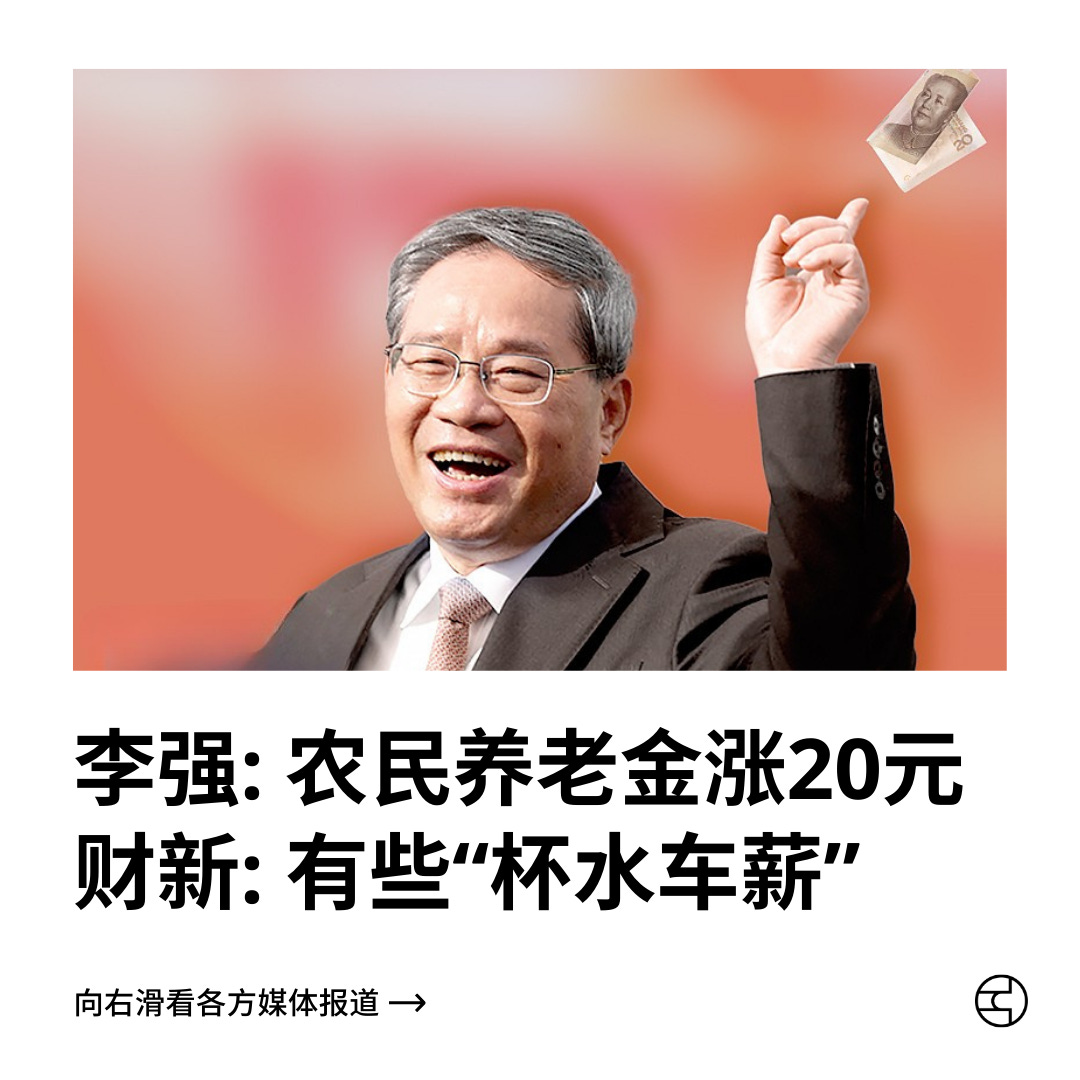 李强: 农民养老金涨20元 财新: 有些“杯水车薪”