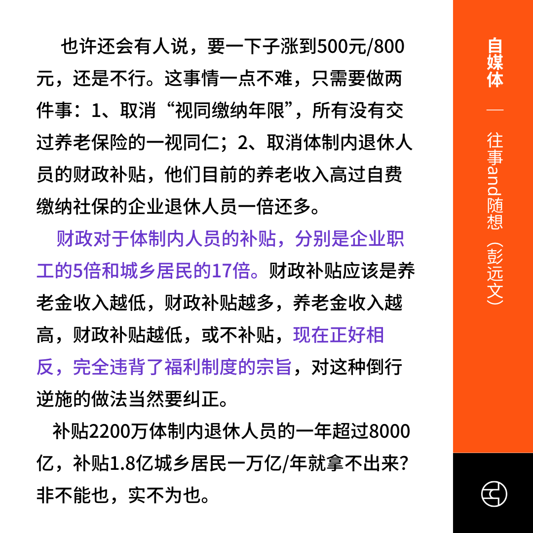《往事and随想(彭远文)》拿出10000亿把农民基础养老金提高到500元很难吗?