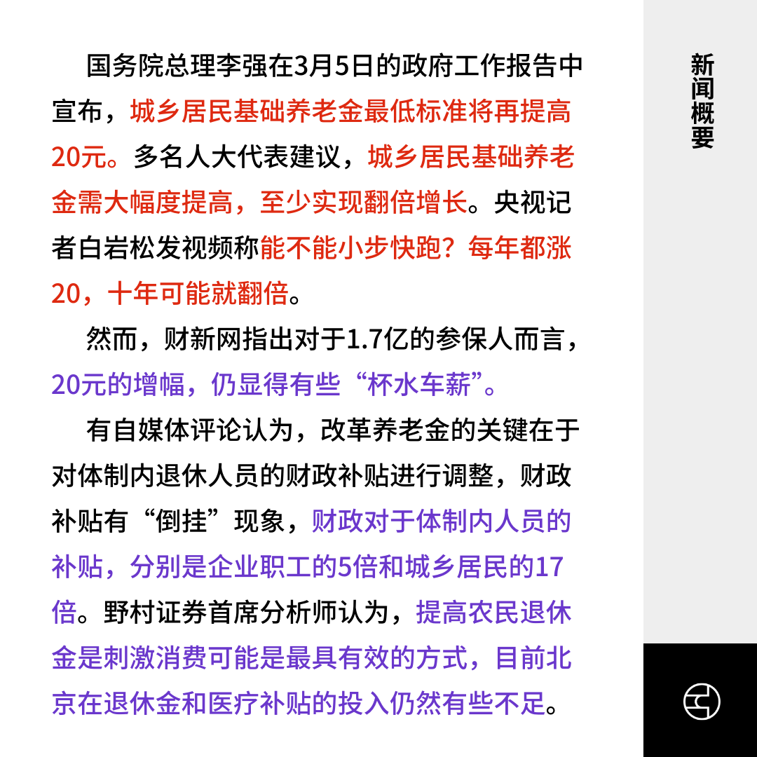 国务院总理李强在3月5日的政府工作报告中宣布,城乡居民基础养老金最低标准将再提高20元。多名人大代表建议,城乡居民基础养老金需大幅度提高,至少实现翻倍增长。央视记者白岩松发视频称能不能小步快跑?每年都涨20,十年可能就翻倍。