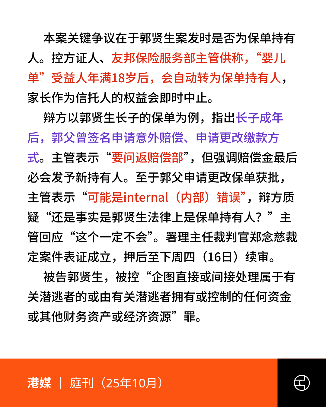 《庭刊》(25年10月)郭鳳儀父涉處理女兒保單案|友邦保險服務部主管供稱 「嬰兒單」受益人成年後自動成持有人 辯方指被告長子成年後仍由被告代申索償 主管:要問返賠償部