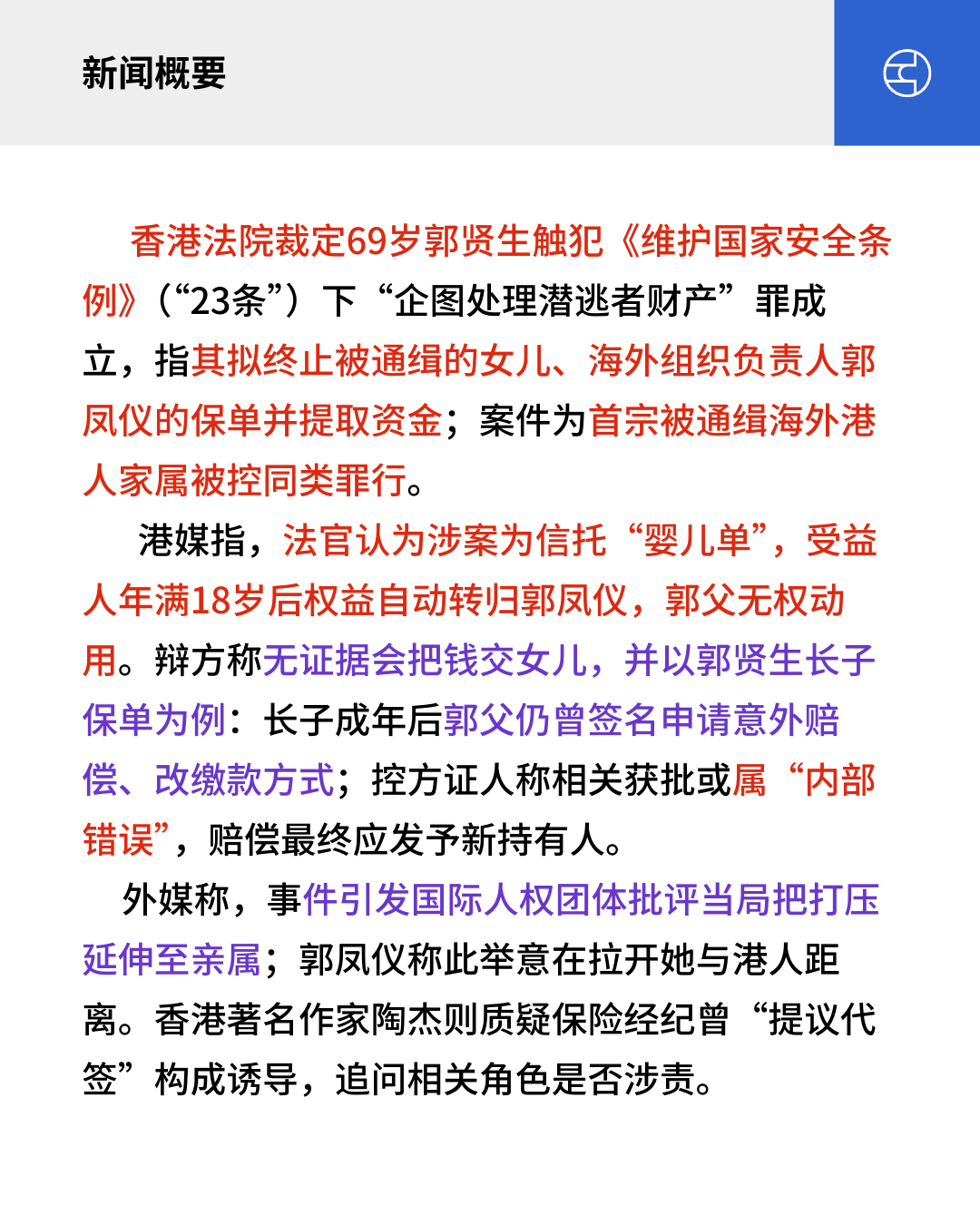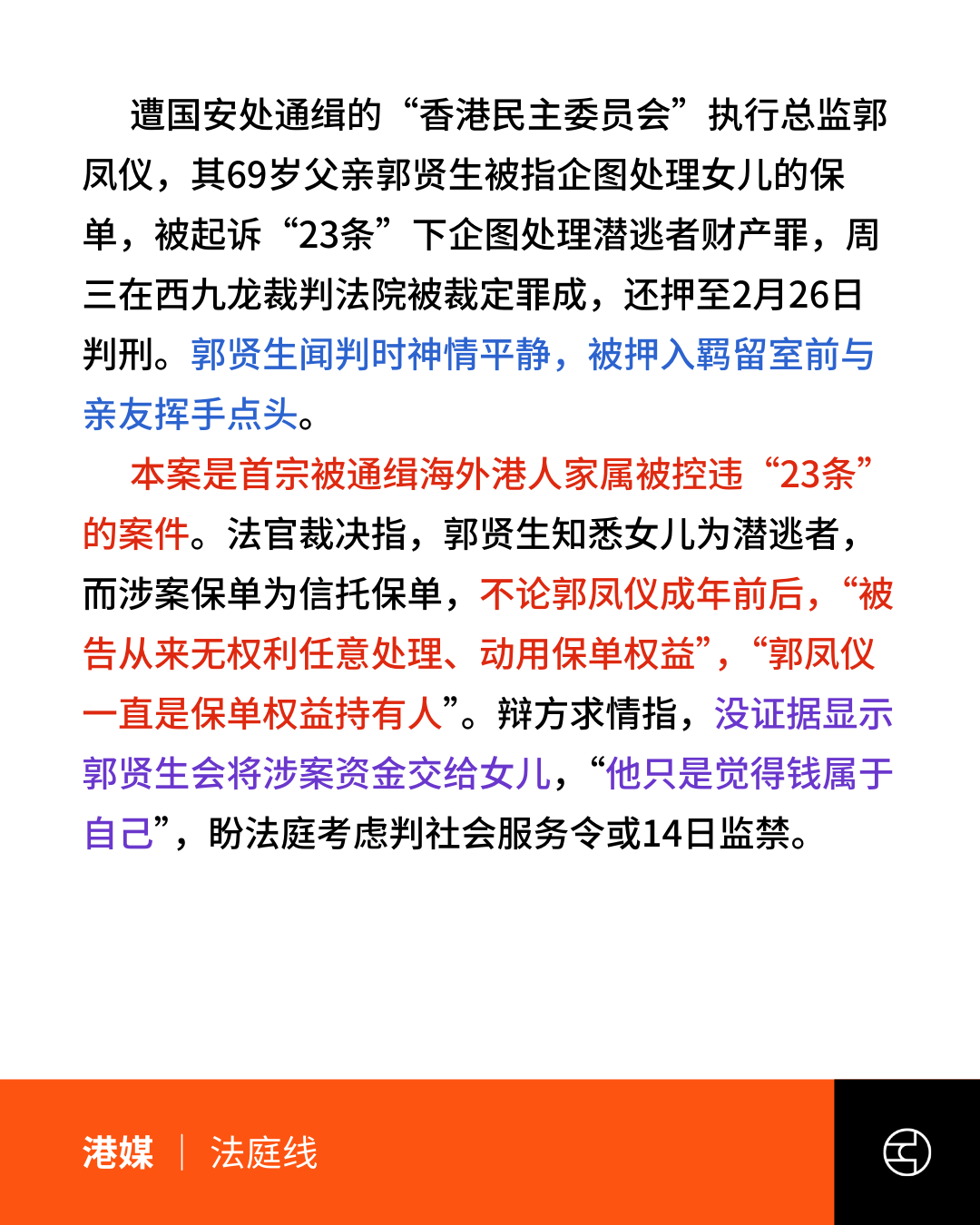 香港法院裁定69岁郭贤生触犯《维护国家安全条例》(“23条”)下“企图处理潜逃者财产”罪成立,指其拟终止被通缉的女儿、海外组织负责人郭凤仪的保单并提取资金;案件为首宗被通缉海外港人家属被控同类罪行。