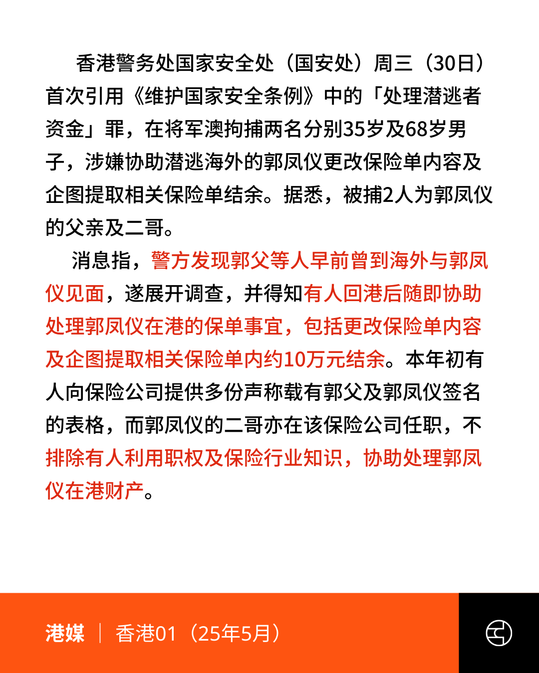 《香港01》(25年5月)郭凤仪父兄被捕|消息﹕父女海外见面后改保单拟助女提10万结余