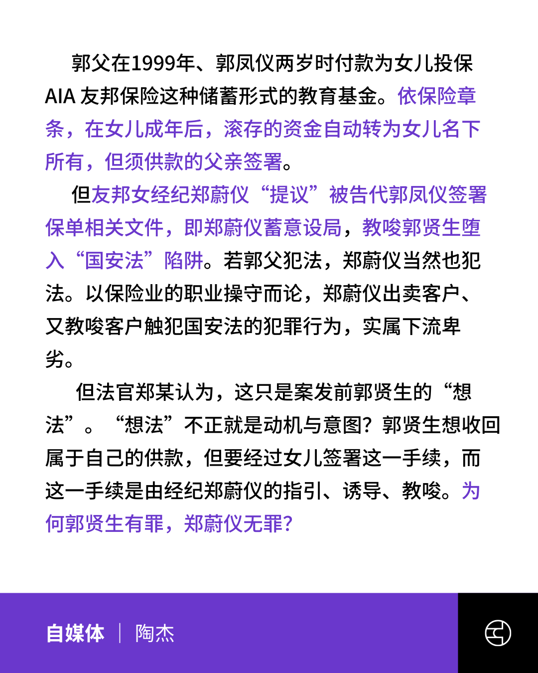 港媒指,法官认为涉案为信托“婴儿单”,受益人年满18岁后权益自动转归郭凤仪,郭父无权动用。辩方称无证据会把钱交女儿,并以郭贤生长子保单为例:长子成年后郭父仍曾签名申请意外赔偿、改缴款方式;控方证人称相关获批或属“内部错误”,赔偿最终应发予新持有人。