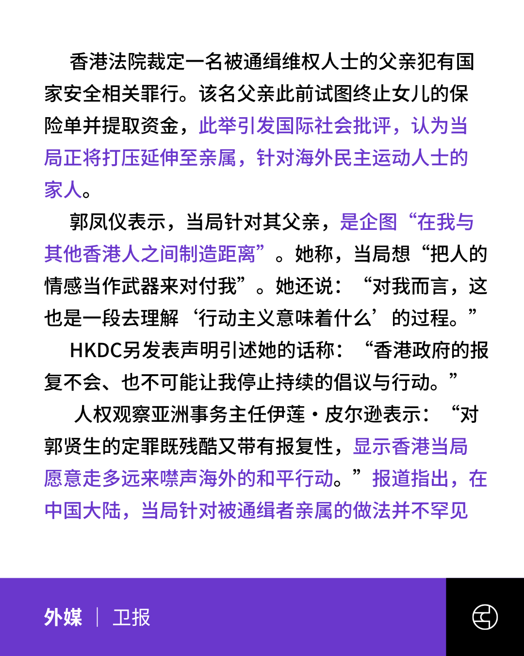 外媒称,事件引发国际人权团体批评当局把打压延伸至亲属;郭凤仪称此举意在拉开她与港人距离。香港著名作家陶杰则质疑保险经纪曾“提议代签”构成诱导,追问相关角色是否涉责。