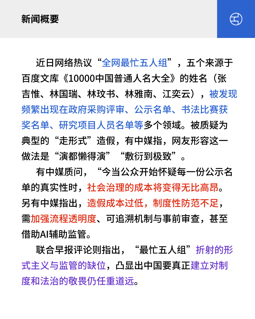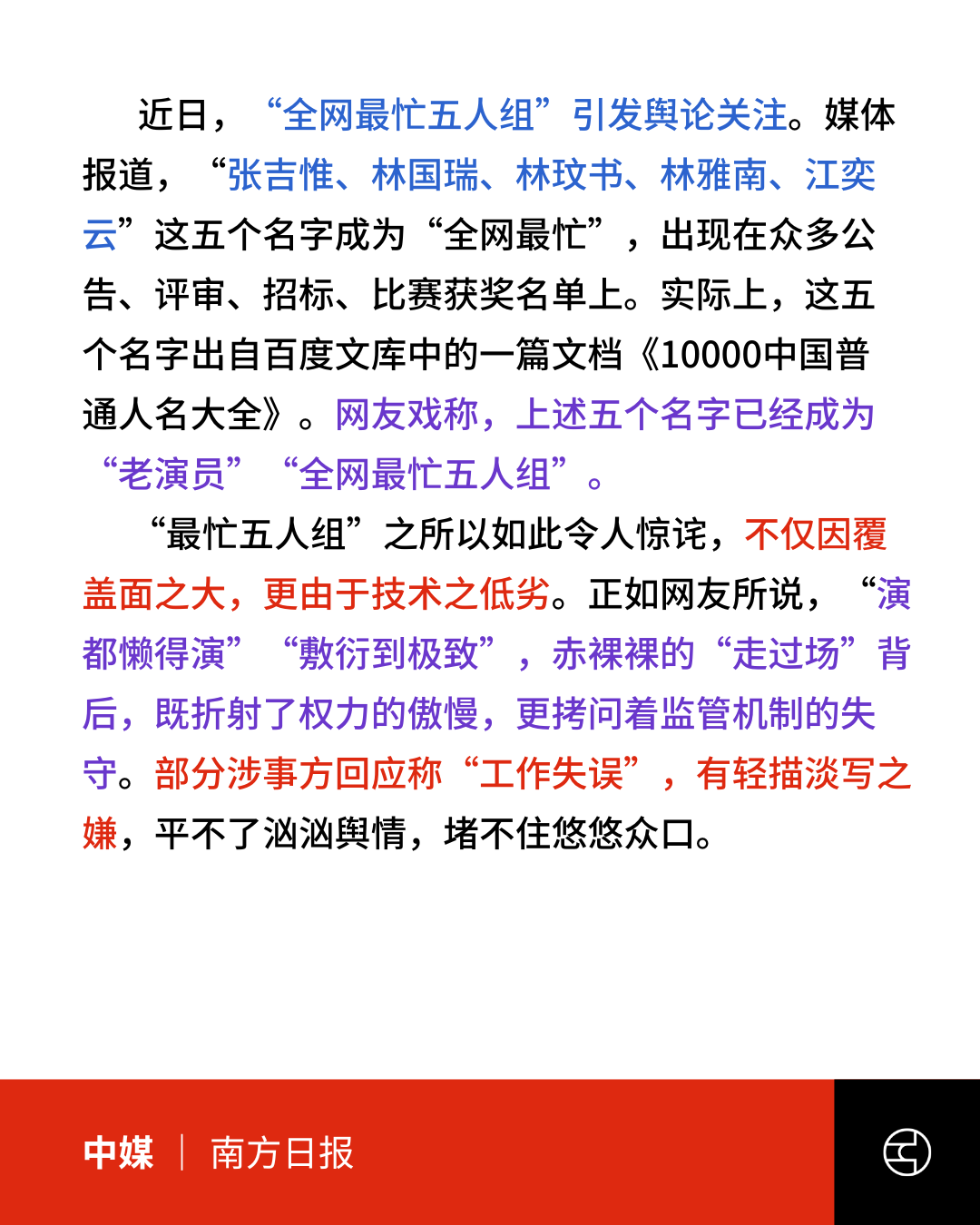 近日网络热议“全网最忙五人组”,五个来源于百度文库《10000中国普通人名大全》的姓名(张吉惟、林国瑞、林玟书、林雅南、江奕云),被发现频繁出现在政府采购评审、公示名单、书法比赛获奖名单、研究项目人员名单等多个领域。被质疑为典型的“走形式”造假,有中媒指,网友形容这一做法是“演都懒得演”“敷衍到极致”。