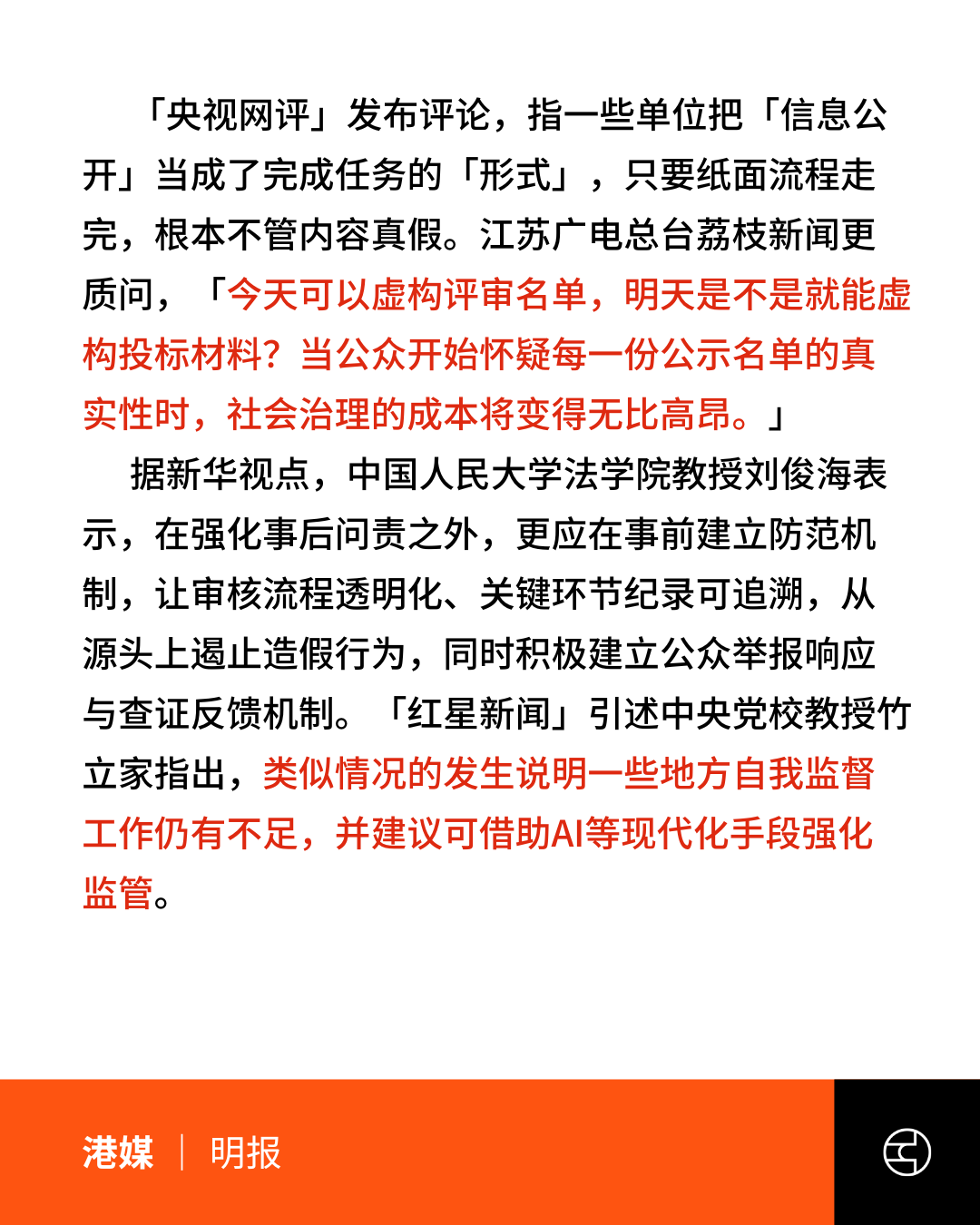 有中媒质问,“今当公众开始怀疑每一份公示名单的真实性时,社会治理的成本将变得无比高昂。另有中媒指出,造假成本过低,制度性防范不足,需加强流程透明度、可追溯机制与事前审查,甚至借助AI辅助监管。