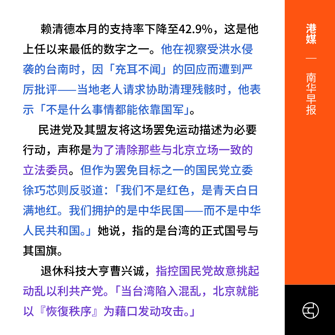 《南华早报》Taiwan recall: shock waves likely no matter who prevails on ballots, analysts say