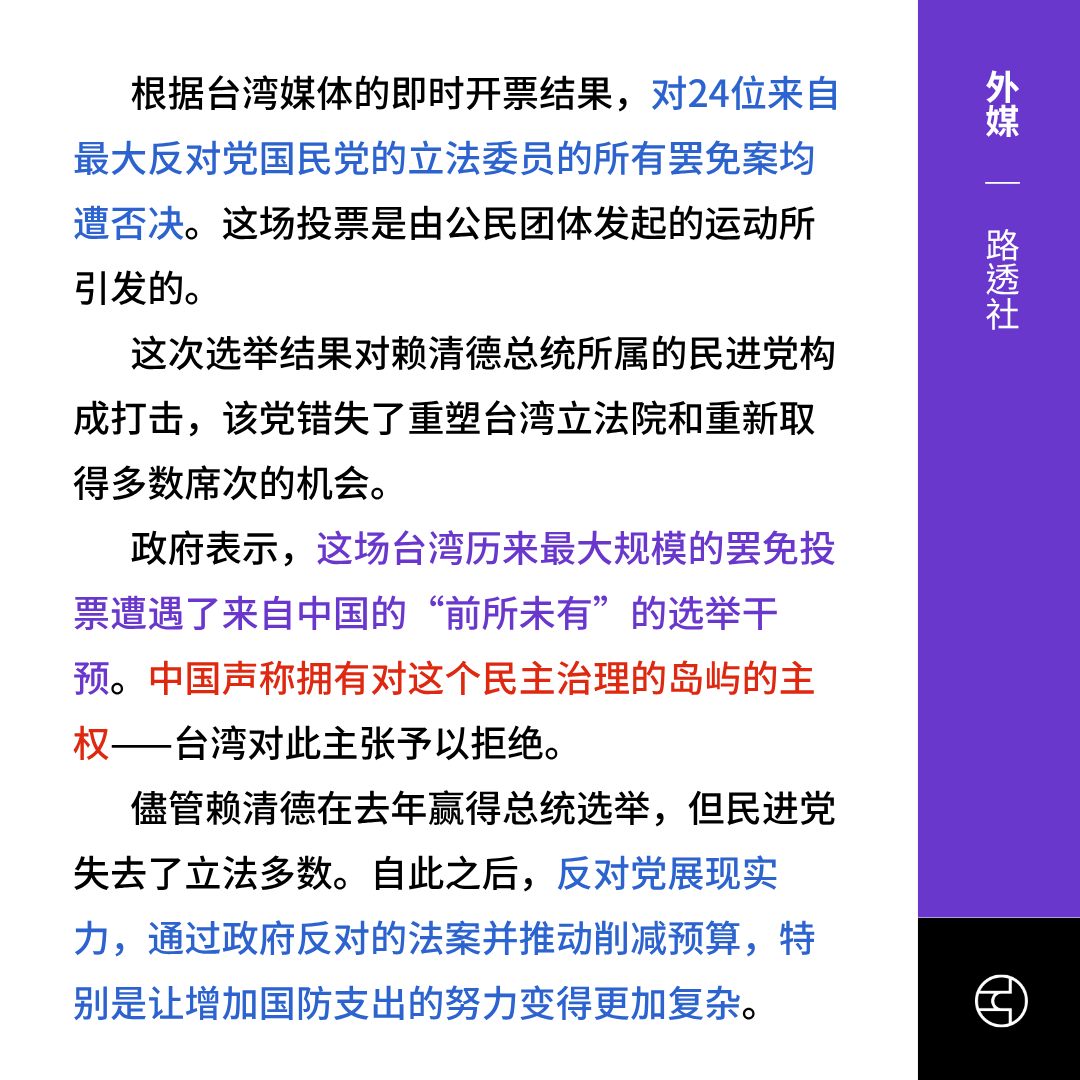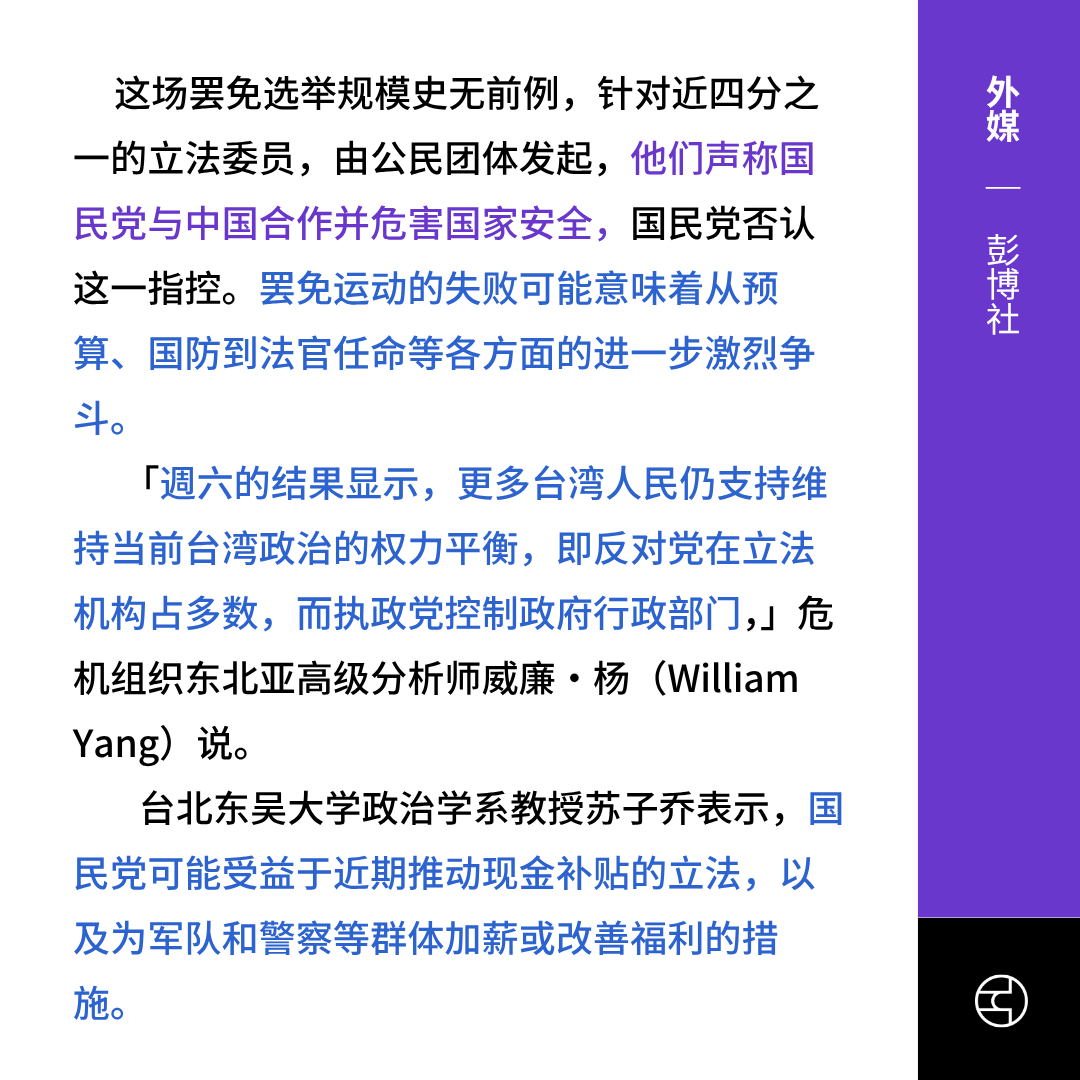 《彭博社》Taiwan Opposition Defeats Recall, Keeps Legislative Control