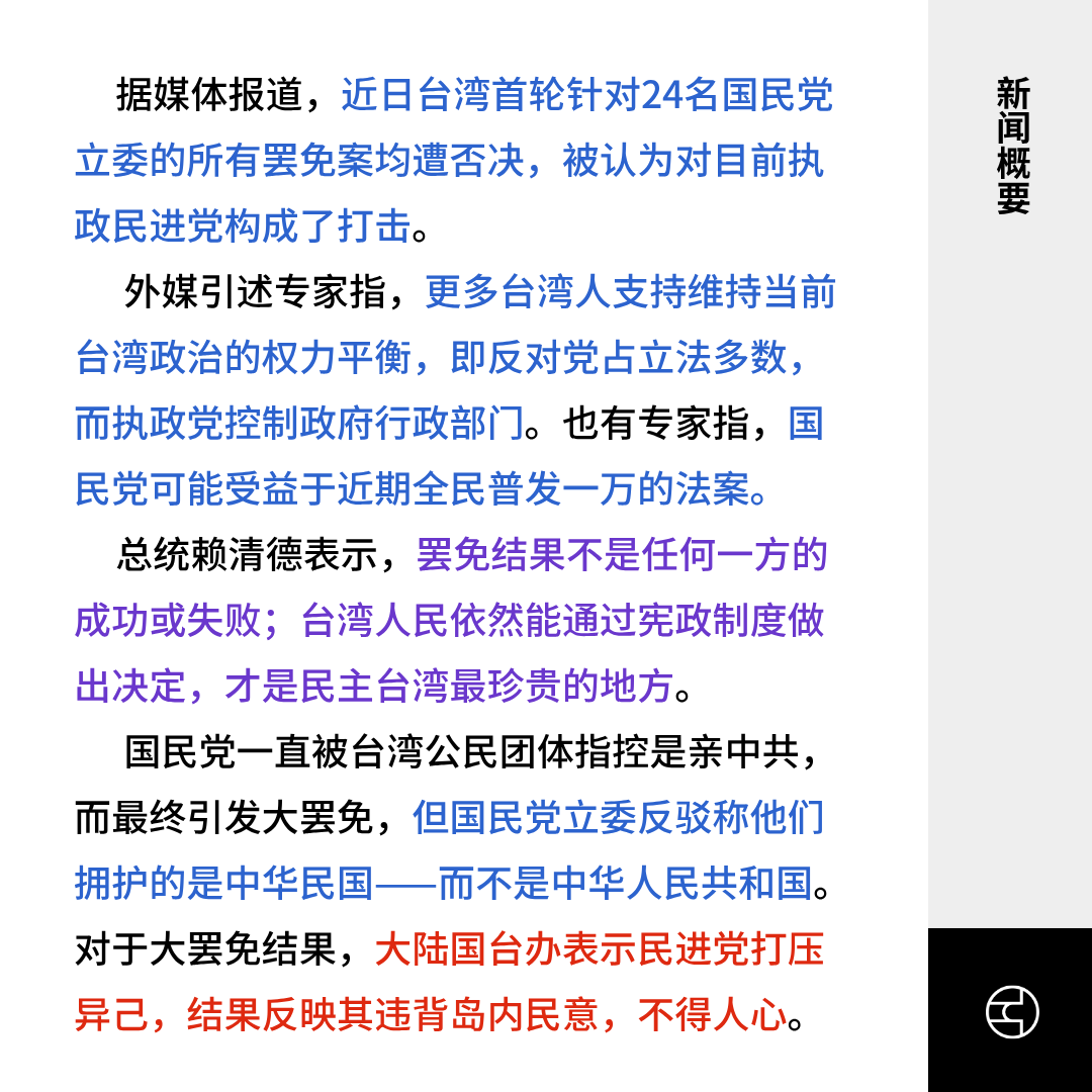 据媒体报道,近日台湾首轮针对24名国民党立委的所有罢免案均遭否决,被认为对目前执政民进党构成了打击。