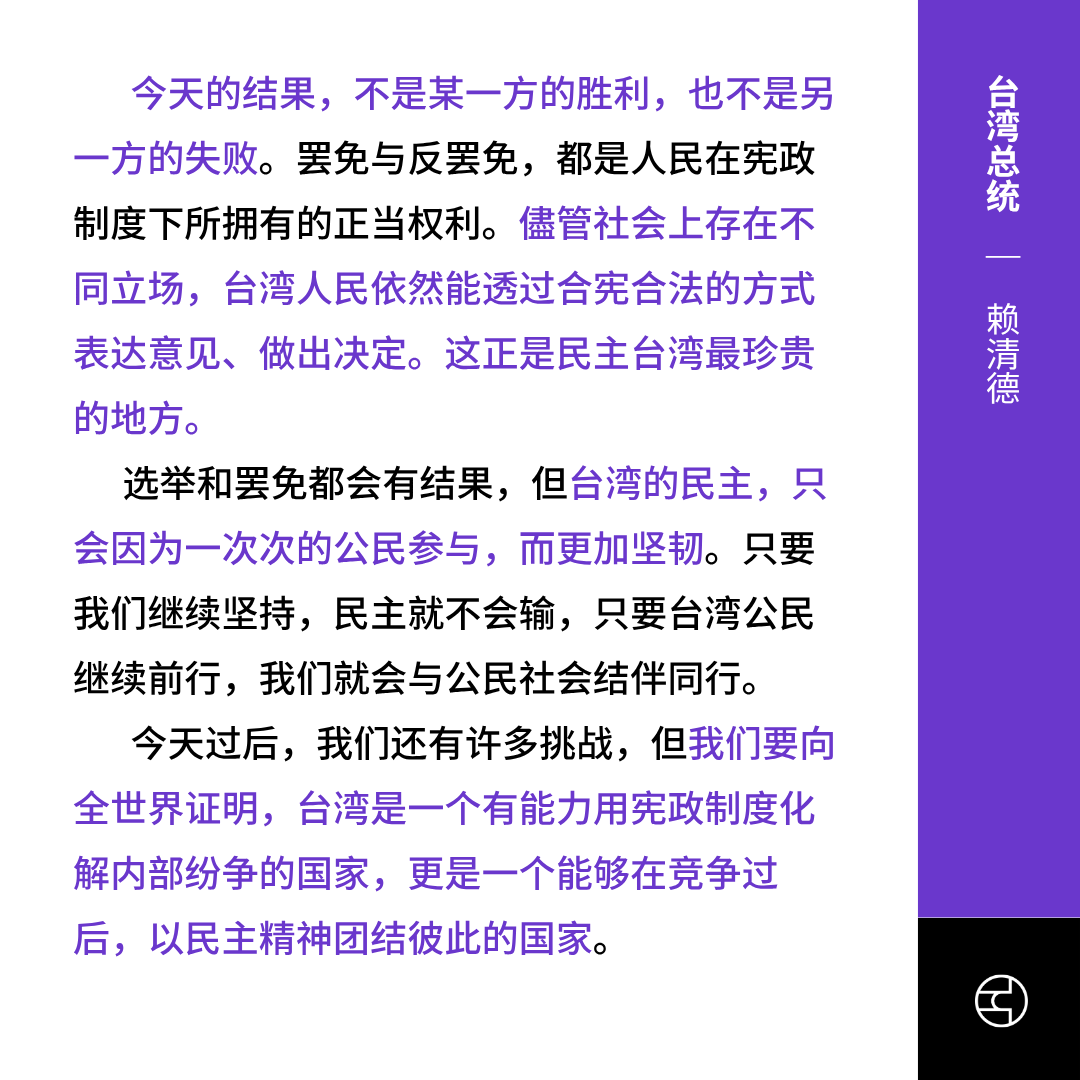 台湾首轮大罢免全被否决,赖清德:民主将更坚韧
