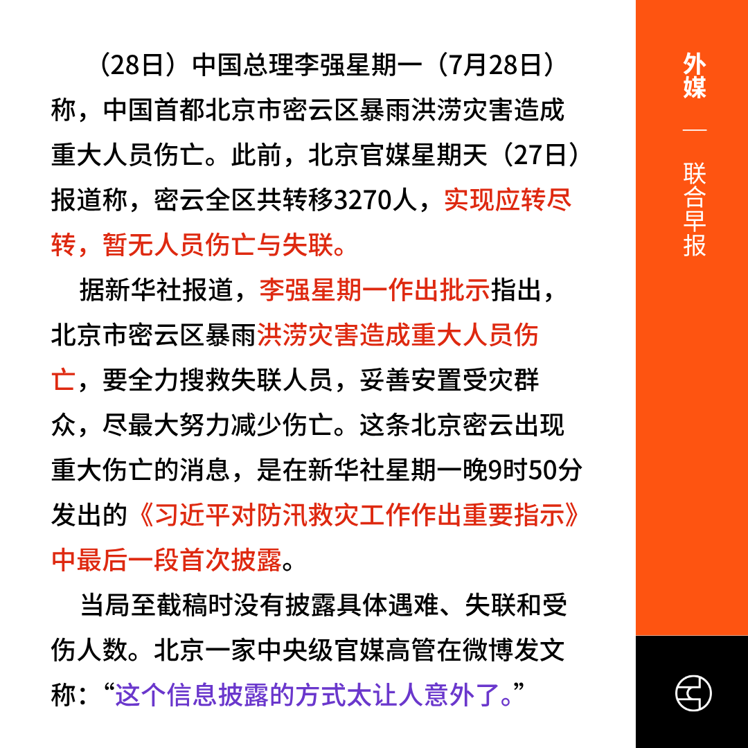 《联合早报》李强:北京密云暴雨洪涝灾害造成重大人员伤亡