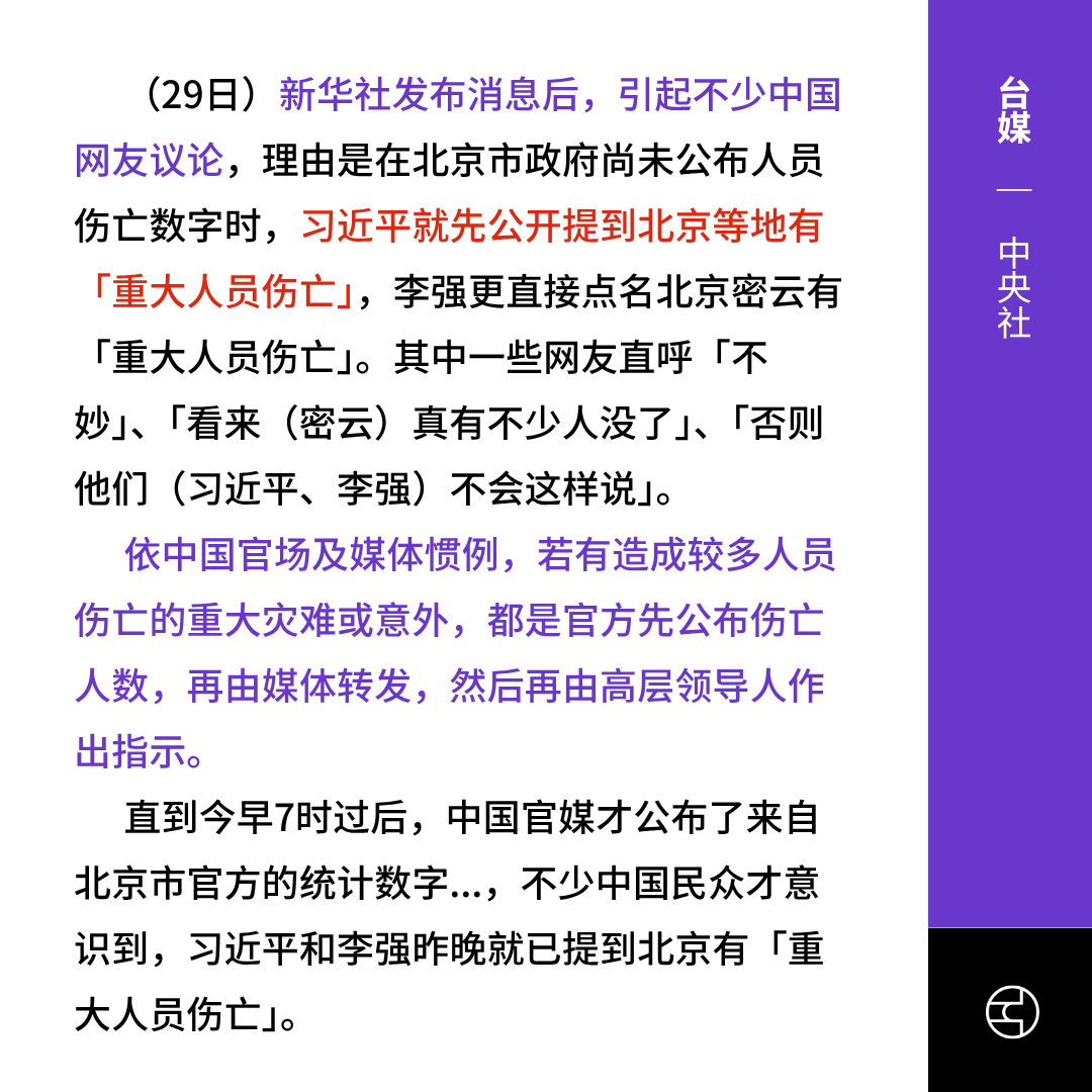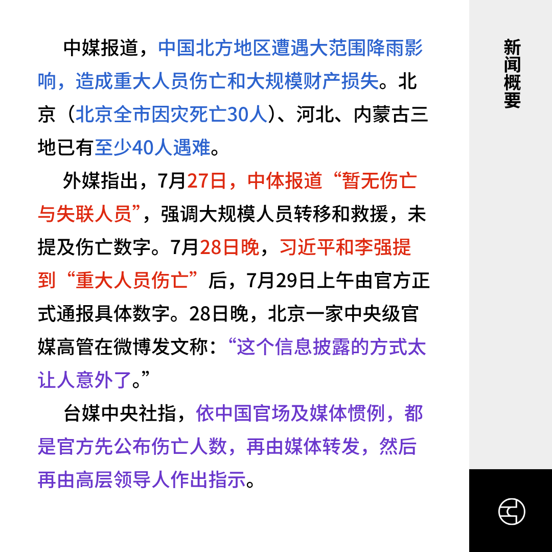 外媒指出,7月27日,中体报道“暂无伤亡与失联人员”,强调大规模人员转移和救援,未提及伤亡数字。7月28日晚,习近平和李强提到“重大人员伤亡”后,7月29日上午由官方正式通报具体数字。28日晚,北京一家中央级官媒高管在微博发文称:“这个信息披露的方式太让人意外了。”