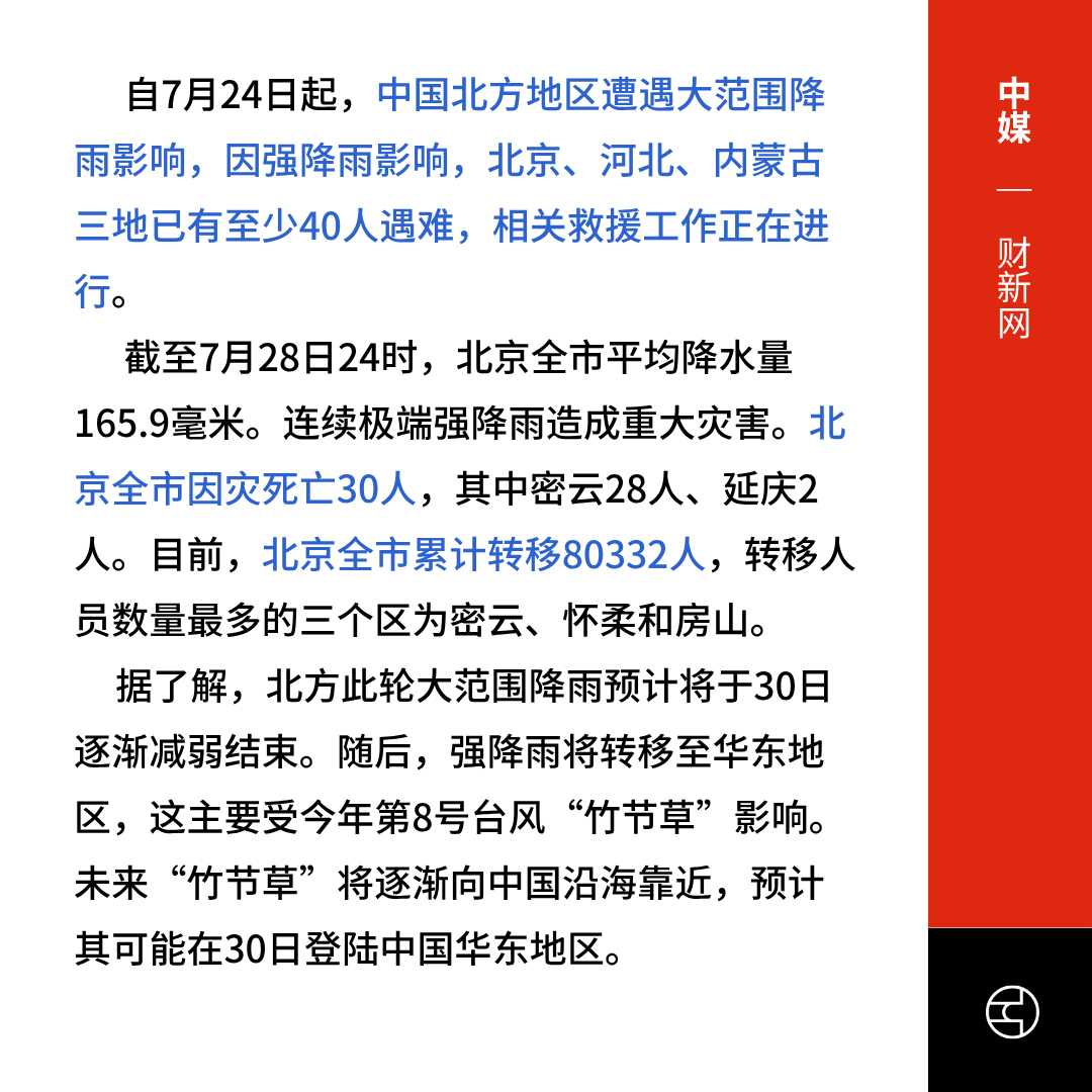 中媒报道,中国北方地区遭遇大范围降雨影响,造成重大人员伤亡和大规模财产损失。北京(北京全市因灾死亡30人)、河北、内蒙古三地已有至少40人遇难。