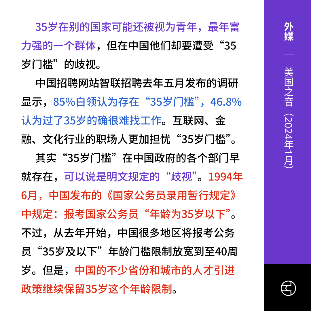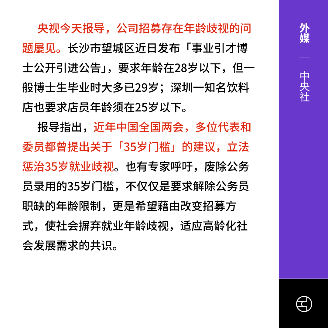 外媒报导“35岁门槛”已成为中国职场普遍现象。招聘调查显示,85%白领认为存在年龄歧视,近半数受访者表示35岁后求职难度显著增加。近年虽然部分地区放宽公务员招聘年龄至40岁,但许多地方的政策仍沿用35岁限制。