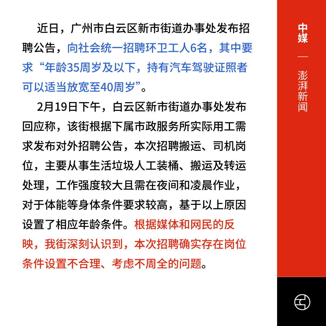 《澎湃新闻》广州一街道招聘环卫工要求不超35岁?街道办:不属公务员和事业编制