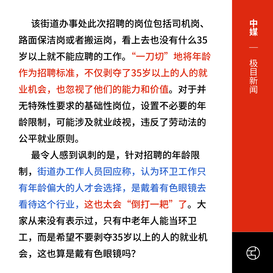 《极目新闻》评论称,基础性岗位不应设严格年龄限制,否则可能是就业歧视。并批评街道办说民众带有色眼镜,实为“倒打一耙”。