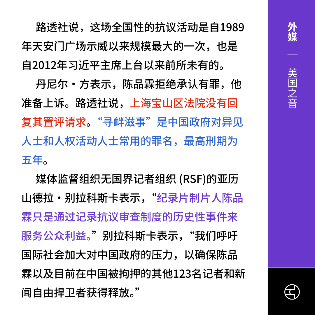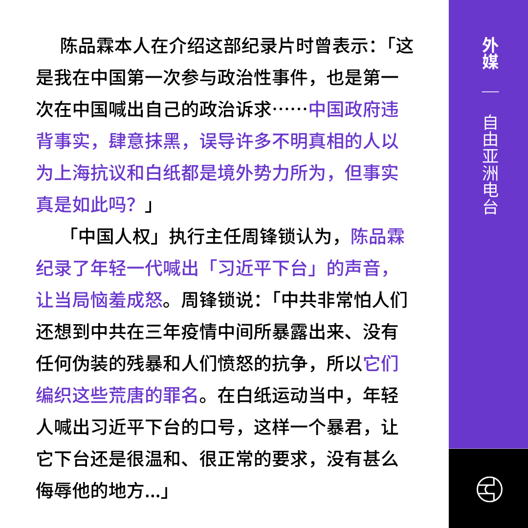 《美国之音》中国法院重判“白纸运动”纪录片制片人陈品霖,重新唤醒清零记忆