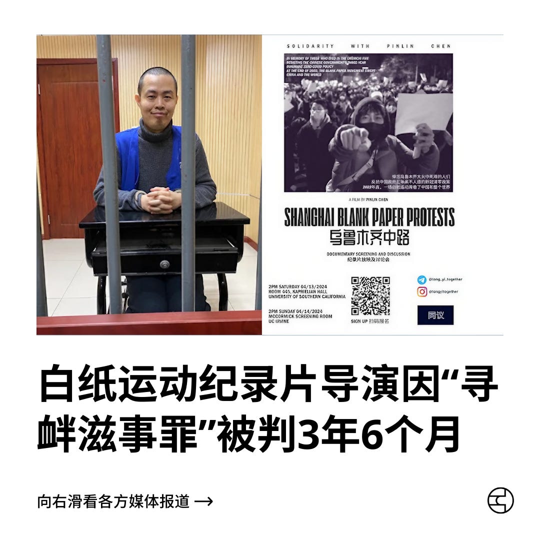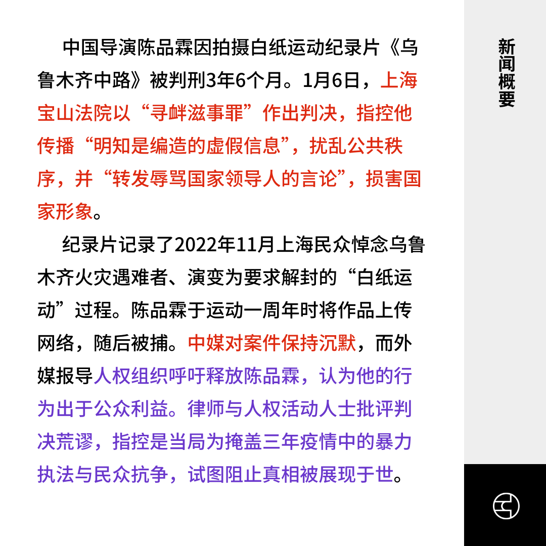 中国导演陈品霖因拍摄白纸运动纪录片《乌鲁木齐中路》被判刑3年6个月。1月6日,上海宝山法院以“寻衅滋事罪”作出判决,指控他传播“明知是编造的虚假信息”,扰乱公共秩序,并“转发辱骂国家领导人的言论”,损害国家形象。