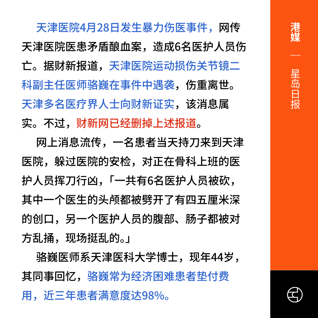 《星岛日报》天津医院多名医护被斩 著名骨科医生骆巍不治
