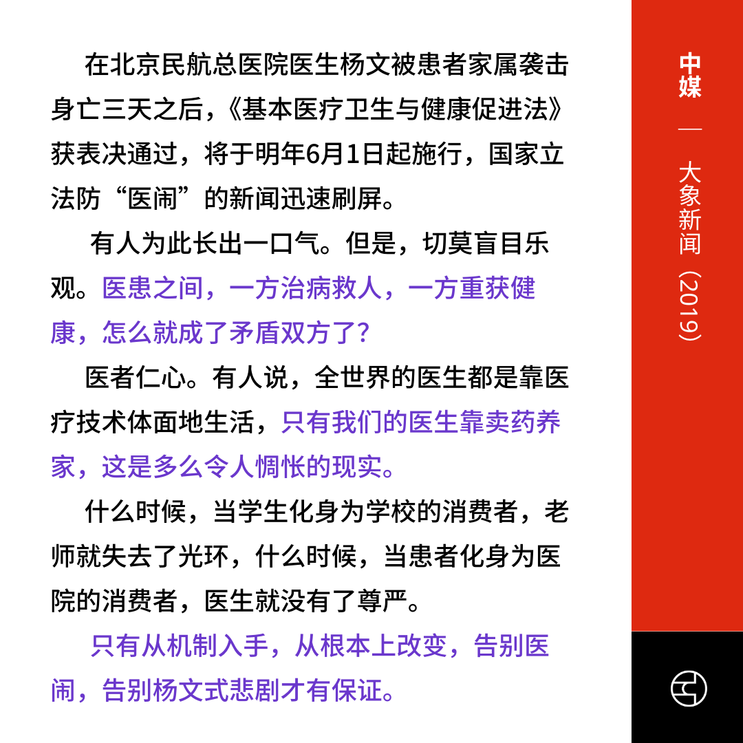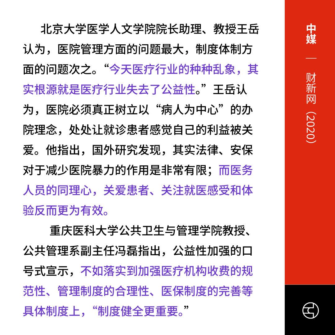 有中媒在2019和2020年时指出虽然中国已经立法防“医闹”,但专家认为仅靠安保与刑罚不足以根治,需完善医保支付、收费透明与院方管理,重建医患互信,恢复医疗公益性,方能从制度层面降低暴力风险。