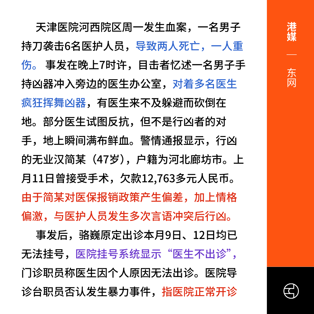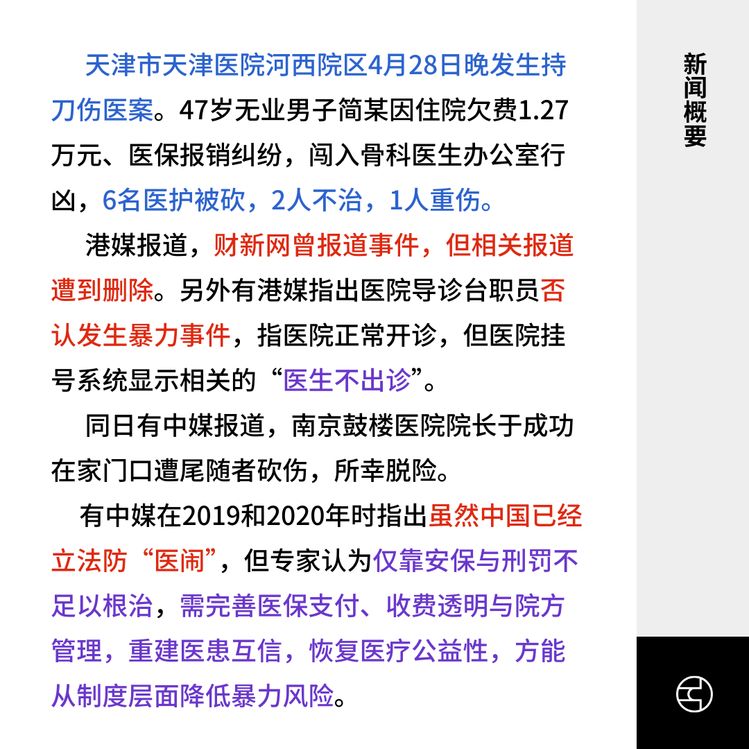 天津市天津医院河西院区4月28日晚发生持刀伤医案。47岁无业男子简某因住院欠费1.27万元、医保报销纠纷,闯入骨科医生办公室行凶,6名医护被砍,2人不治,1人重伤。