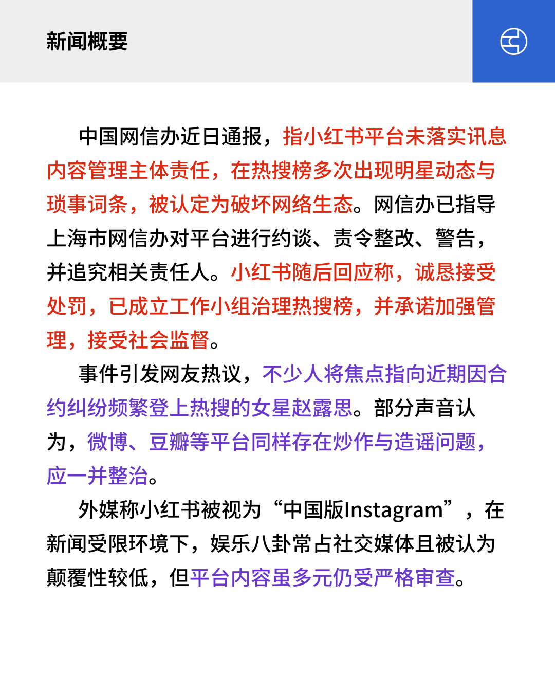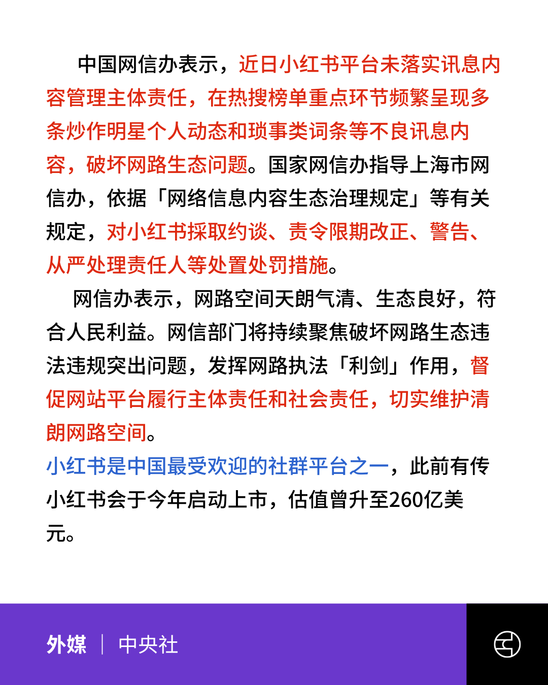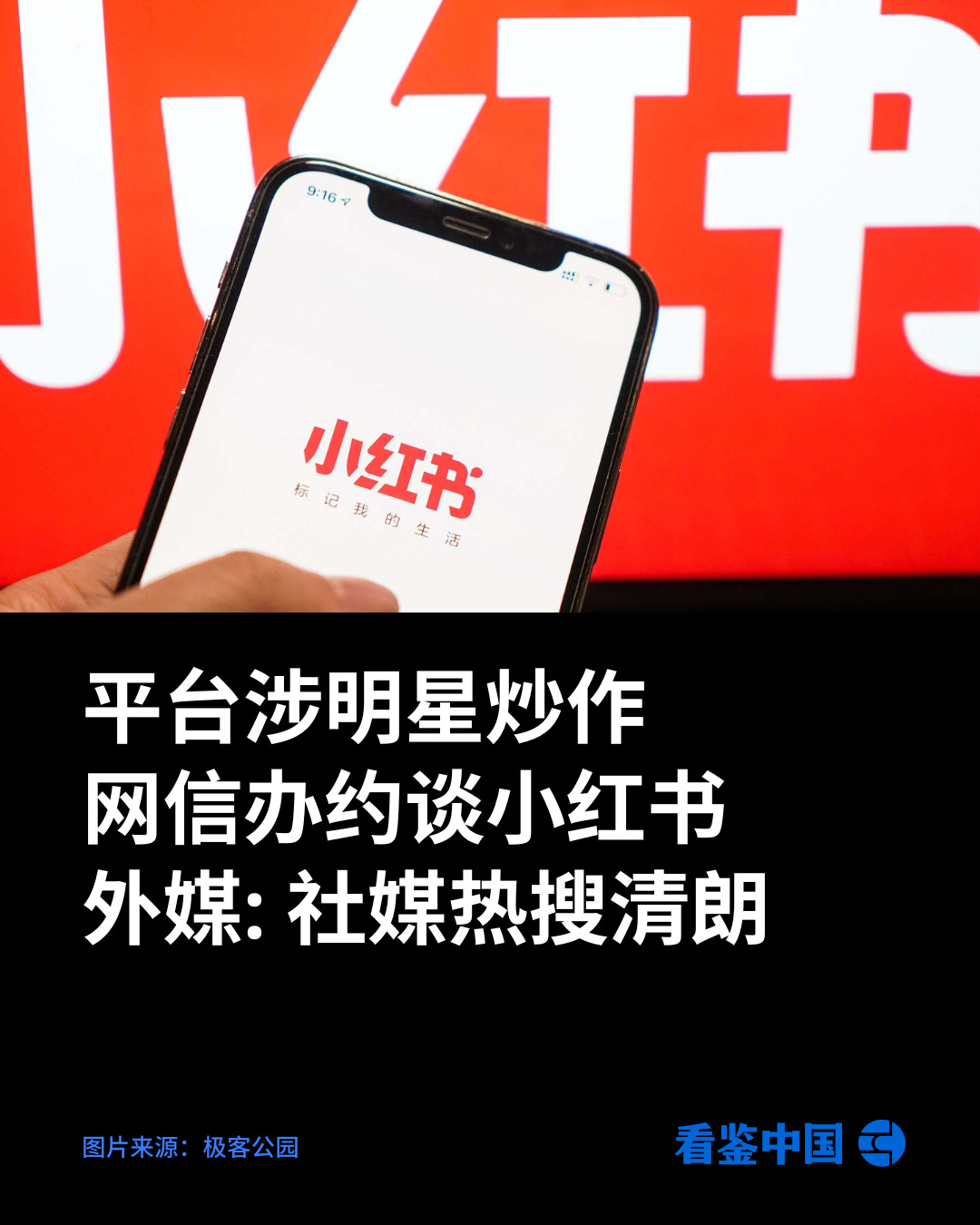 平台涉明星炒作 网信办约谈小红书 外媒: 社媒热搜清朗