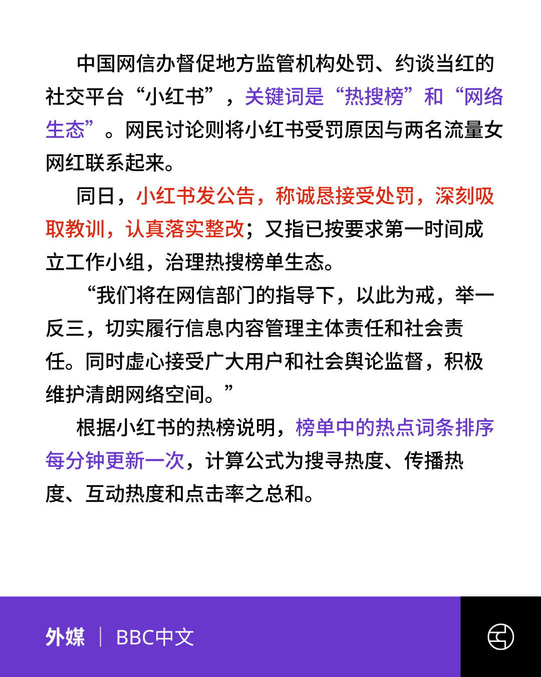 《BBC中文》小红书被罚:社交媒体热搜榜成为“清朗”对象