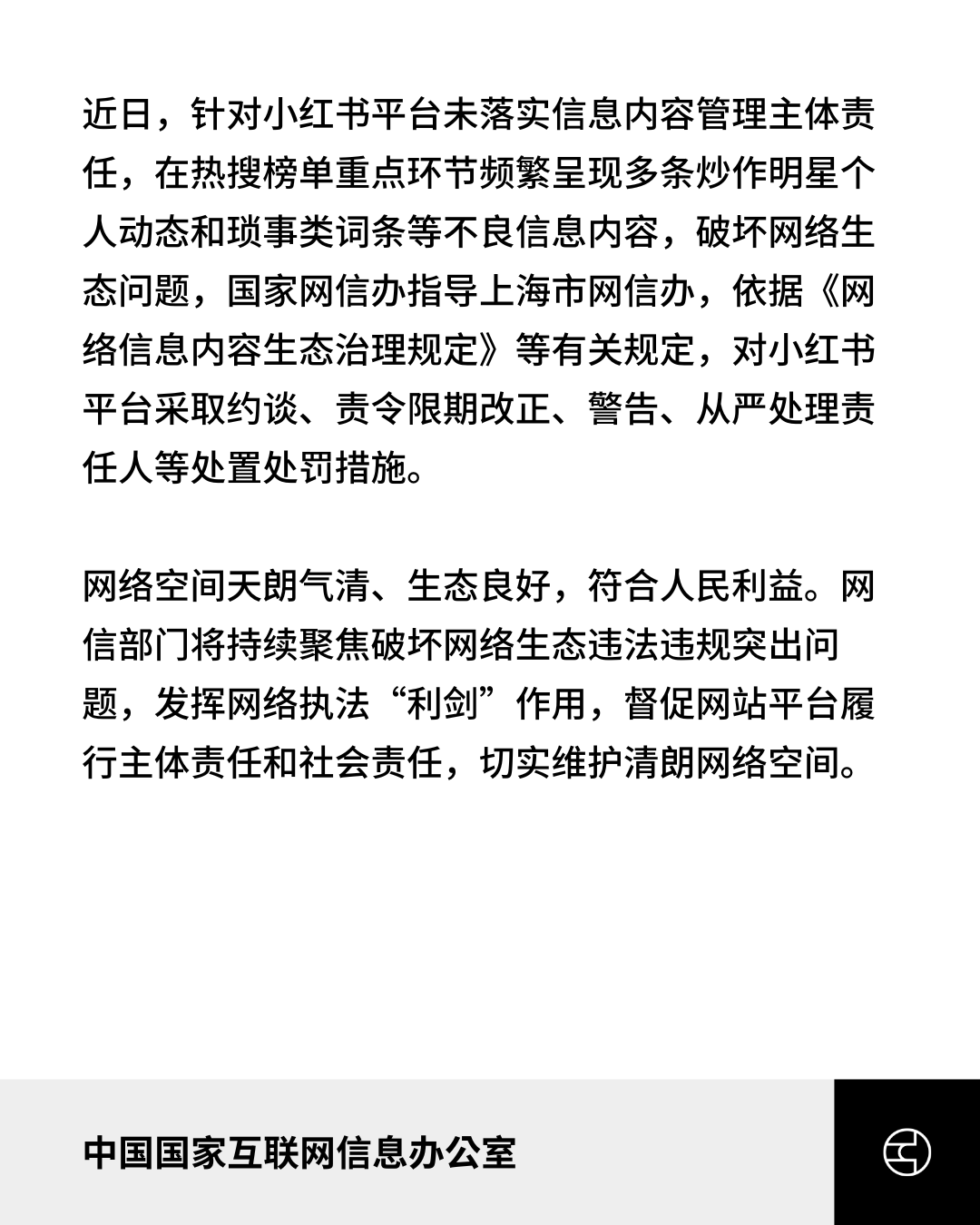 中国网信办近日通报,指小红书平台未落实讯息内容管理主体责任,在热搜榜多次出现明星动态与琐事词条,被认定为破坏网络生态。网信办已指导上海市网信办对平台进行约谈、责令整改、警告,并追究相关责任人。小红书随后回应称,诚恳接受处罚,已成立工作小组治理热搜榜,并承诺加强管理,接受社会监督。