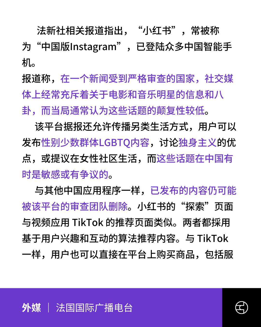 《法国国际广播电台》中国网信办下令查处 “小红书” 称其“破坏网路生态”仍受严格审查。