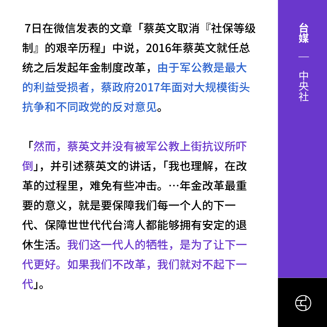 有网友发表微信文章,举台湾军公教年金改革为例,称总统蔡英文并没有被军公教上街抗议所吓倒,顶住利益群体压力,最终完成制度调整,保障年轻一代的退休保障。