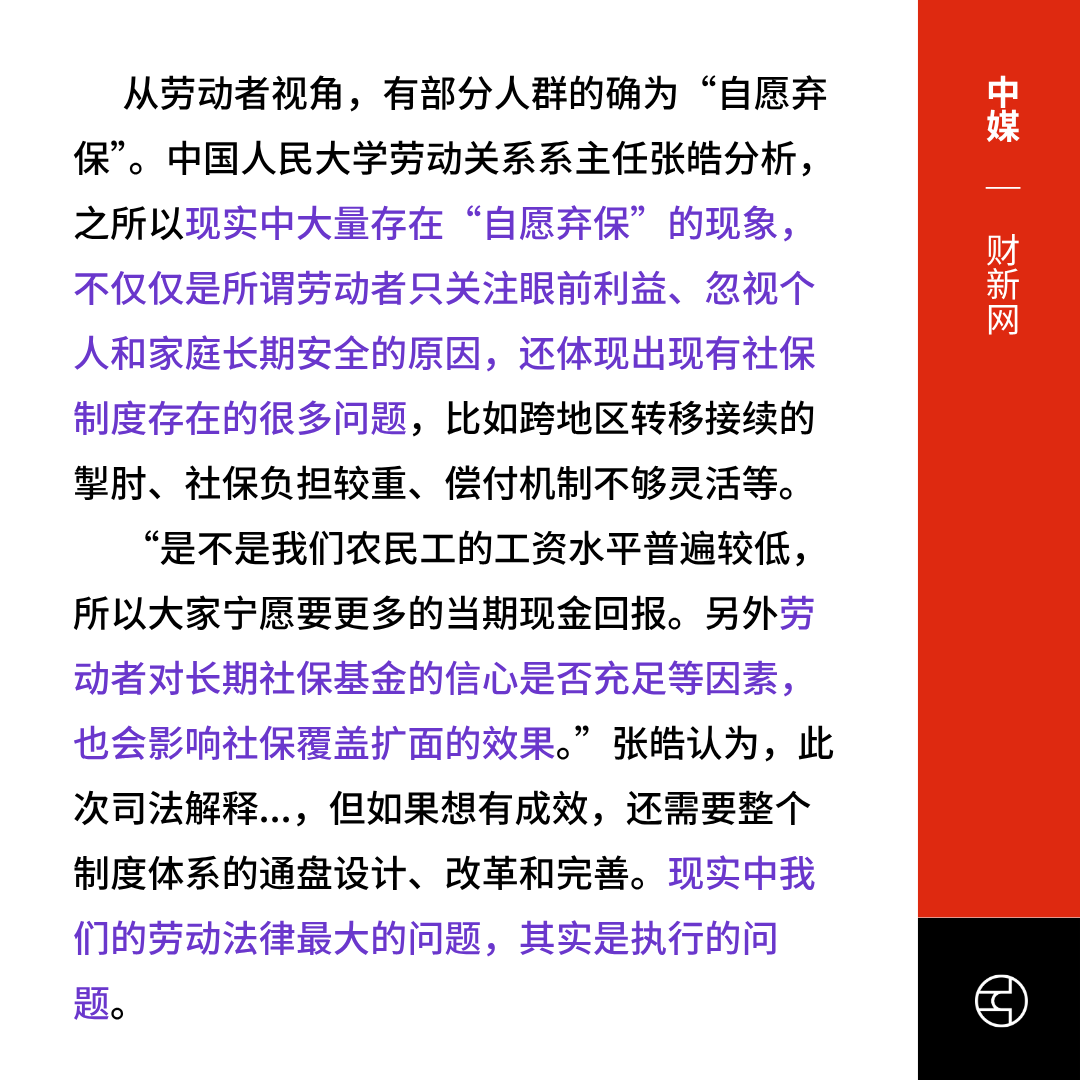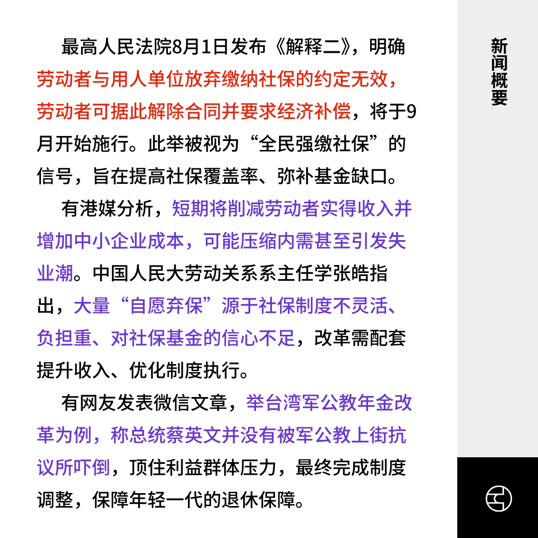 最高人民法院8月1日发布《解释二》,明确劳动者与用人单位放弃缴纳社保的约定无效,劳动者可据此解除合同并要求经济补偿,将于9月开始施行。此举被视为“全民强缴社保”的信号,旨在提高社保覆盖率、弥补基金缺口。