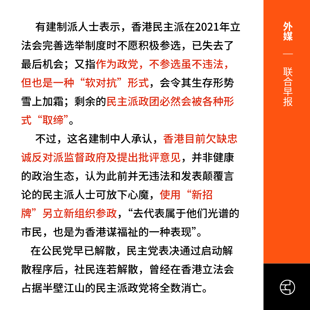 《联合早报》香港社民连据报将启动解散 泛民政团将“清零”