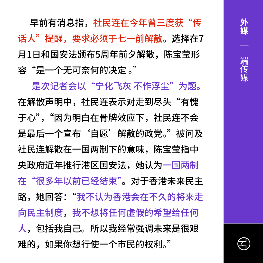 《端传媒》香港社民连指因巨大政治压力解散:有愧于心但没其他选择|Whatsnew