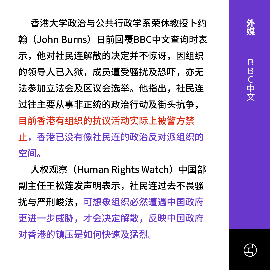 有香港教授受访时表示他对社民连解散的决定并不惊讶,香港已没有像社民连的政治反对派组织的空间。