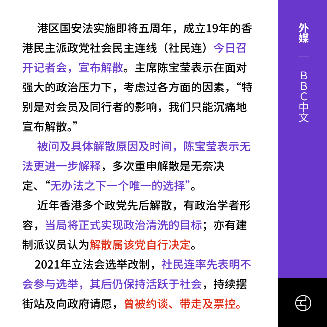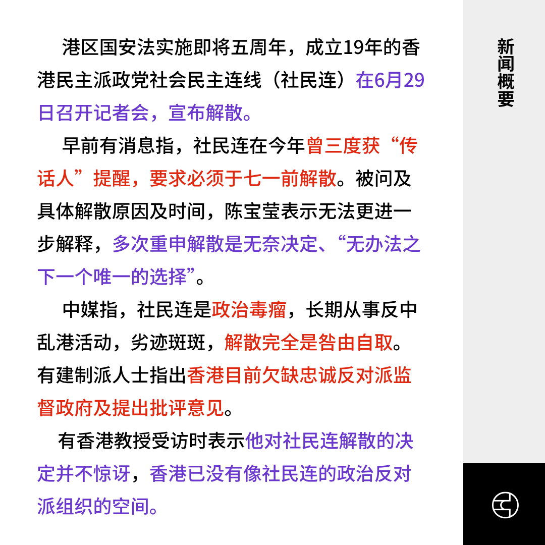 港区国安法实施即将五周年,成立19年的香港民主派政党社会民主连线(社民连)在6月29日召开记者会,宣布解散。
