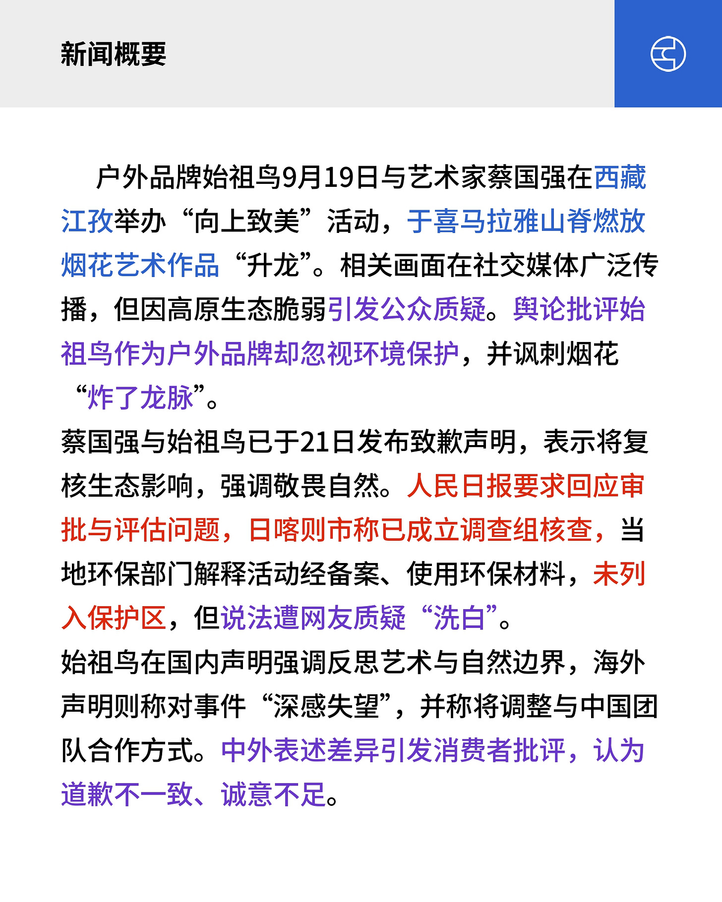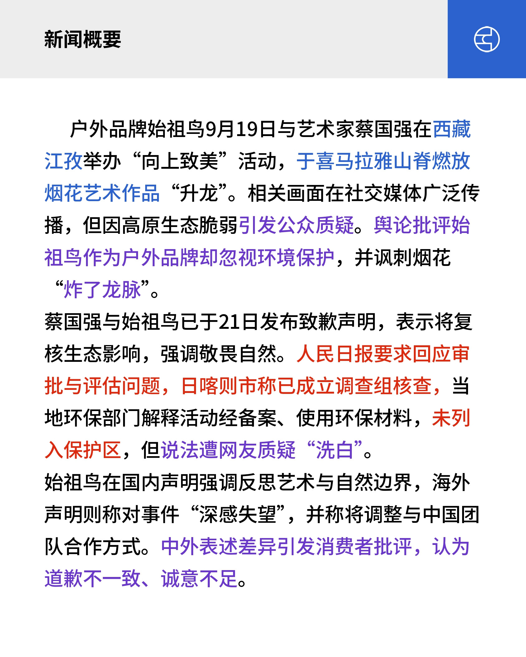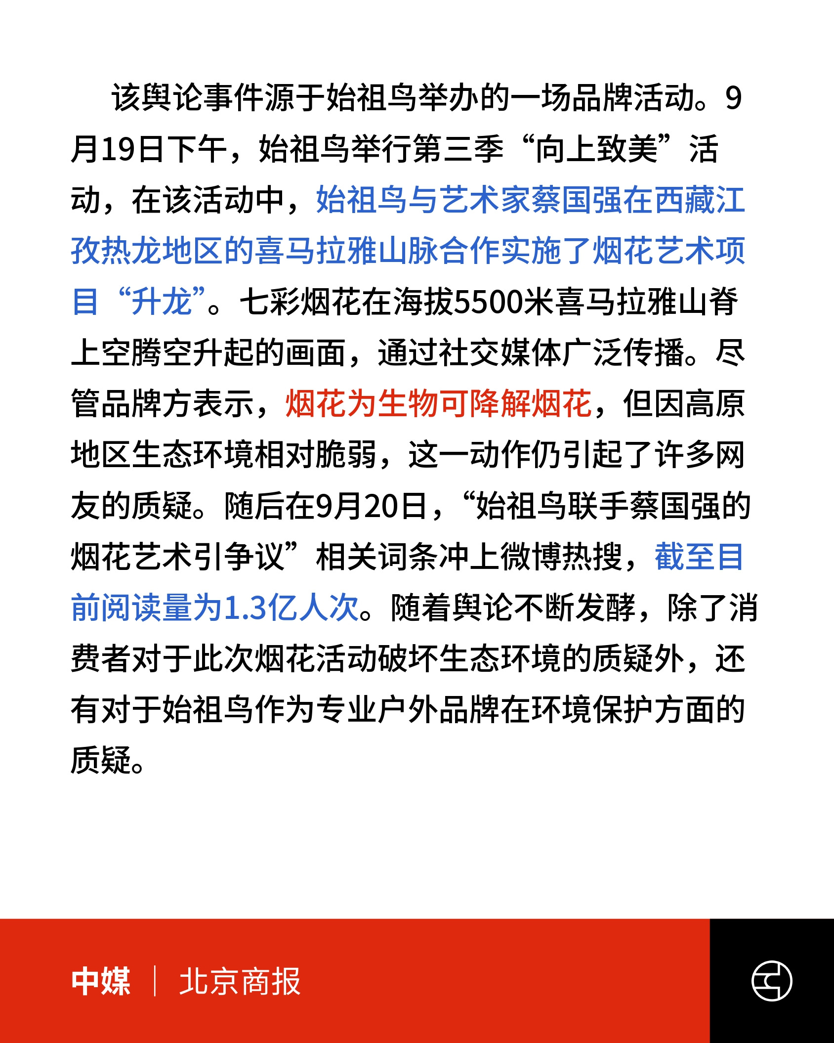 户外品牌始祖鸟9月19日与艺术家蔡国强在西藏江孜举办“向上致美”活动,于喜马拉雅山脊燃放烟花艺术作品“升龙”。相关画面在社交媒体广泛传播,但因高原生态脆弱引发公众质疑。舆论批评始祖鸟作为户外品牌却忽视环境保护,并讽刺烟花“炸了龙脉”。