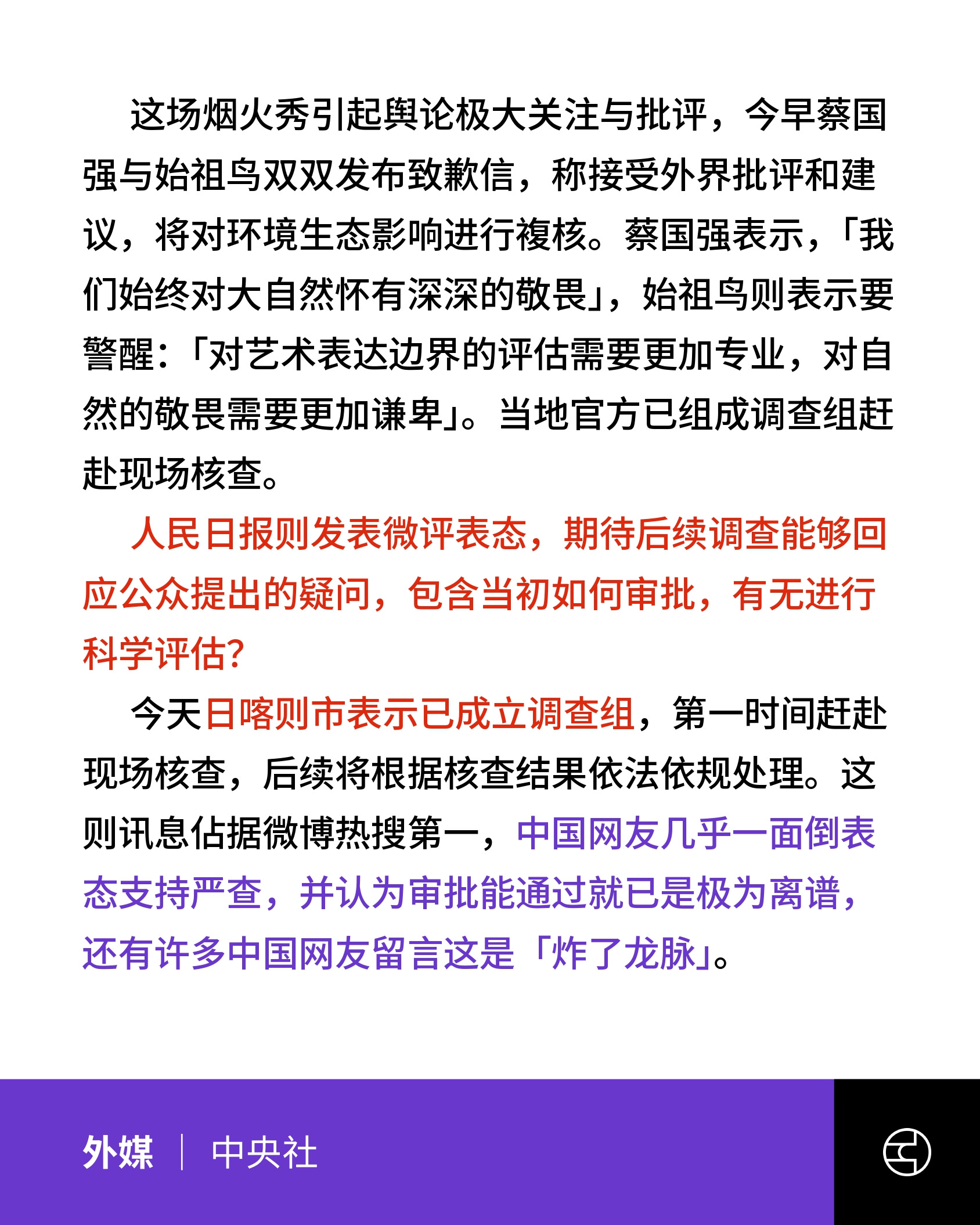 蔡国强与始祖鸟已于21日发布致歉声明,表示将复核生态影响,强调敬畏自然。人民日报要求回应审批与评估问题,日喀则市称已成立调查组核查,当地环保部门解释活动经备案、使用环保材料,未列入保护区,但说法遭网友质疑“洗白”。