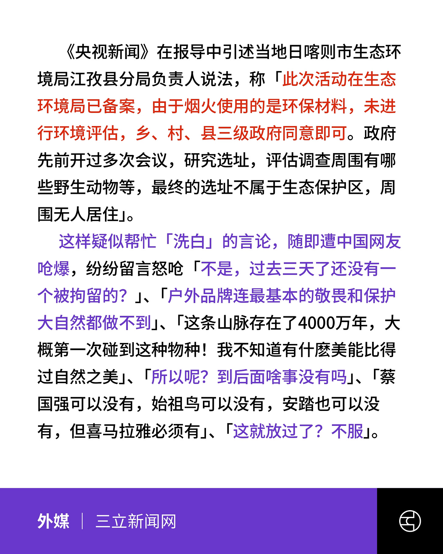 《三立新闻网》始祖鸟炸喜马拉雅山!央视称「该处非生态保护区」 陆网呛爆:所以呢
